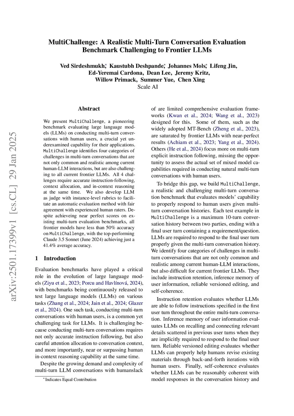 We present MultiChallenge, a pioneering benchmark evaluating large language models (LLMs) on conducting multi-turn conversations with human users, a crucial yet underexamined capability for their applications. MultiChallenge identifies four categories of challenges in multi-turn conversations that are not only common and realistic among current human-LLM interactions, but are also challenging to all current frontier LLMs. All 4 challenges require accurate instruction-following, context allocation, and in-context reasoning at the same time. We also develop LLM as judge with instance-level rubrics to facilitate an automatic evaluation method with fair agreement with experienced human raters. Despite achieving near-perfect scores on existing multi-turn evaluation benchmarks, all frontier models have less than 50% accuracy on MultiChallenge, with the top-performing Claude 3.5 Sonnet (June 2024) achieving just a 41.4% average accuracy.
