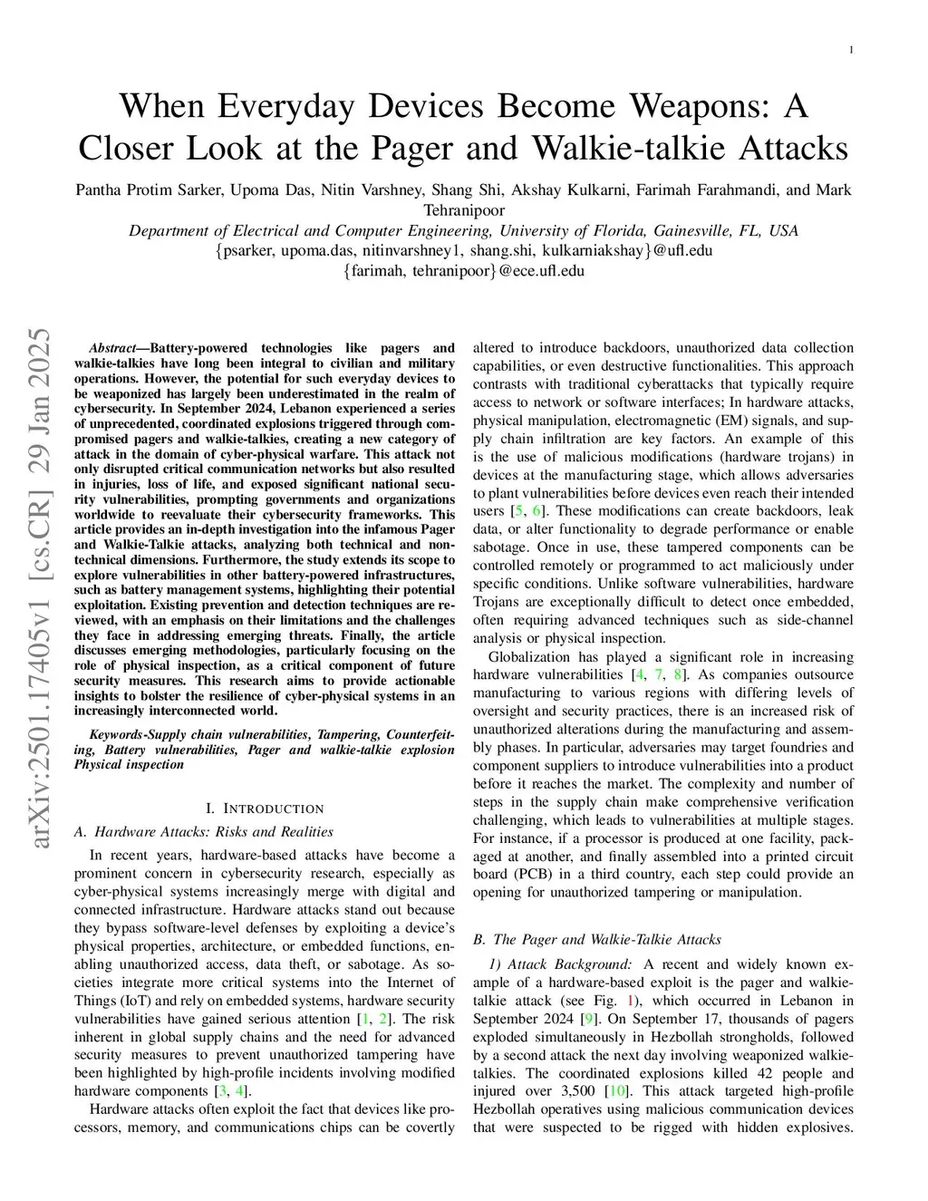 Battery-powered technologies like pagers and walkie-talkies have long been integral to civilian and military operations. However, the potential for such everyday devices to be weaponized has largely been underestimated in the realm of cybersecurity. In September 2024, Lebanon experienced a series of unprecedented, coordinated explosions triggered through compromised pagers and walkie-talkies, creating a new category of attack in the domain of cyber-physical warfare. This attack not only disrupted critical communication networks but also resulted in injuries, loss of life, and exposed significant national security vulnerabilities, prompting governments and organizations worldwide to reevaluate their cybersecurity frameworks. This article provides an in-depth investigation into the infamous Pager and Walkie-Talkie attacks, analyzing both technical and non-technical dimensions. Furthermore, the study extends its scope to explore vulnerabilities in other battery-powered infrastructures, such as battery management systems, highlighting their potential exploitation. Existing prevention and detection techniques are reviewed, with an emphasis on their limitations and the challenges they face in addressing emerging threats. Finally, the article discusses emerging methodologies, particularly focusing on the role of physical inspection, as a critical component of future security measures. This research aims to provide actionable insights to bolster the resilience of cyber-physical systems in an increasingly interconnected world.