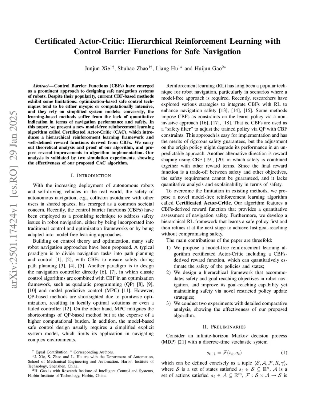 Control Barrier Functions (CBFs) have emerged as a prominent approach to designing safe navigation systems of robots. Despite their popularity, current CBF-based methods exhibit some limitations: optimization-based safe control techniques tend to be either myopic or computationally intensive, and they rely on simplified system models; conversely, the learning-based methods suffer from the lack of quantitative indication in terms of navigation performance and safety. In this paper, we present a new model-free reinforcement learning algorithm called Certificated Actor-Critic (CAC), which introduces a hierarchical reinforcement learning framework and well-defined reward functions derived from CBFs. We carry out theoretical analysis and proof of our algorithm, and propose several improvements in algorithm implementation. Our analysis is validated by two simulation experiments, showing the effectiveness of our proposed CAC algorithm.