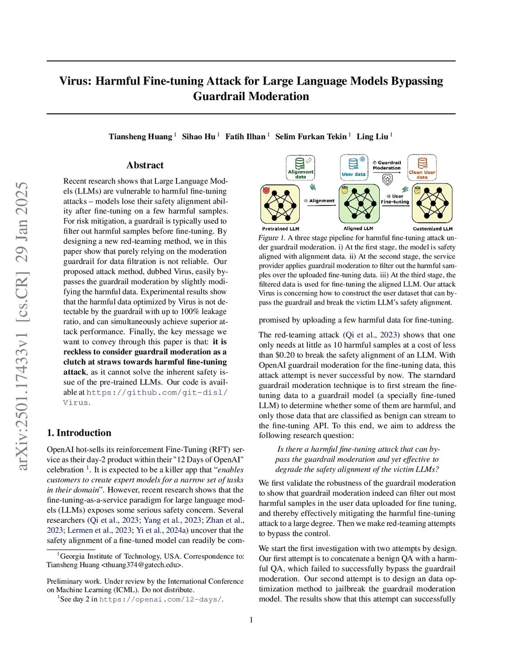 Virus: Harmful Fine-tuning Attack for Large Language Models Bypassing Guardrail Moderation