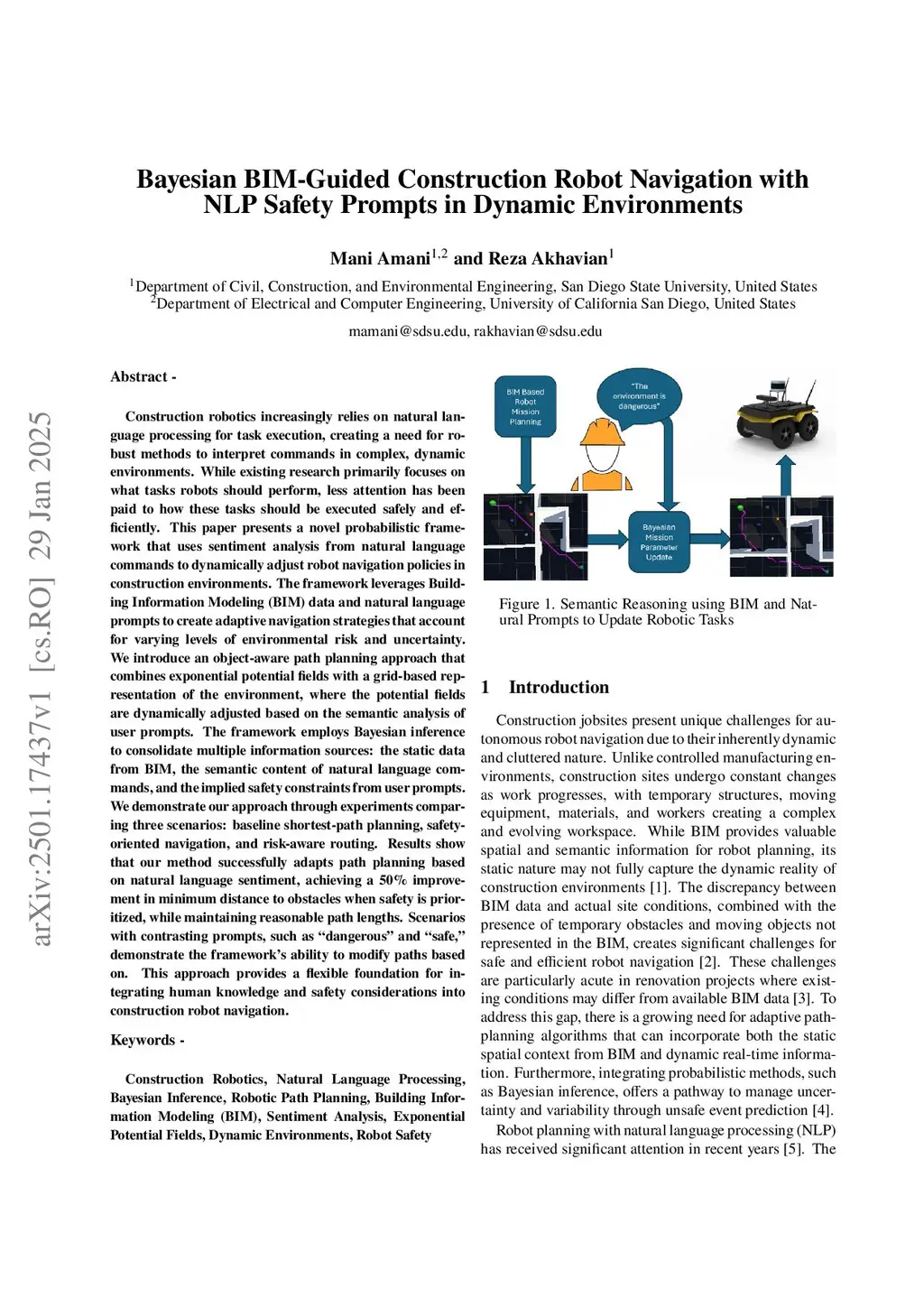 Construction robotics increasingly relies on natural language processing for task execution, creating a need for robust methods to interpret commands in complex, dynamic environments. While existing research primarily focuses on what tasks robots should perform, less attention has been paid to how these tasks should be executed safely and efficiently. This paper presents a novel probabilistic framework that uses sentiment analysis from natural language commands to dynamically adjust robot navigation policies in construction environments. The framework leverages Building Information Modeling (BIM) data and natural language prompts to create adaptive navigation strategies that account for varying levels of environmental risk and uncertainty. We introduce an object-aware path planning approach that combines exponential potential fields with a grid-based representation of the environment, where the potential fields are dynamically adjusted based on the semantic analysis of user prompts. The framework employs Bayesian inference to consolidate multiple information sources: the static data from BIM, the semantic content of natural language commands, and the implied safety constraints from user prompts. We demonstrate our approach through experiments comparing three scenarios: baseline shortest-path planning, safety-oriented navigation, and risk-aware routing. Results show that our method successfully adapts path planning based on natural language sentiment, achieving a 50\% improvement in minimum distance to obstacles when safety is prioritized, while maintaining reasonable path lengths. Scenarios with contrasting prompts, such as "dangerous" and "safe", demonstrate the framework's ability to modify paths. This approach provides a flexible foundation for integrating human knowledge and safety considerations into construction robot navigation.
