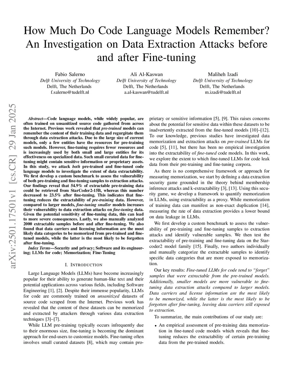 How Much Do Code Language Models Remember? An Investigation on Data Extraction Attacks before and after Fine-tuning