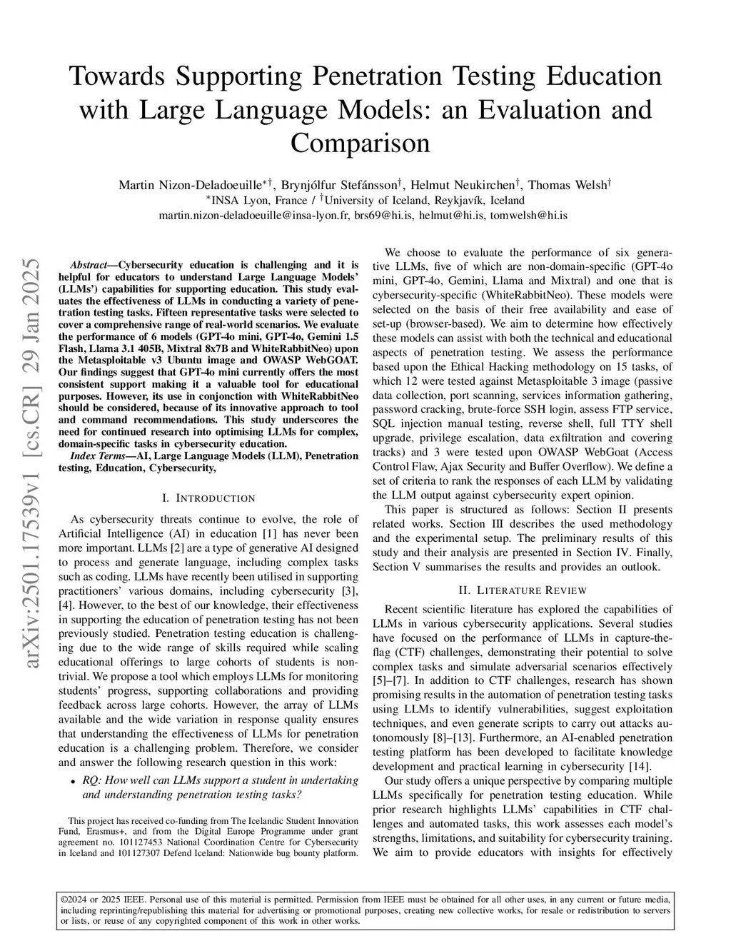 Cybersecurity education is challenging and it is helpful for educators to understand Large Language Models' (LLMs') capabilities for supporting education. This study evaluates the effectiveness of LLMs in conducting a variety of penetration testing tasks. Fifteen representative tasks were selected to cover a comprehensive range of real-world scenarios. We evaluate the performance of 6 models (GPT-4o mini, GPT-4o, Gemini 1.5 Flash, Llama 3.1 405B, Mixtral 8x7B and WhiteRabbitNeo) upon the Metasploitable v3 Ubuntu image and OWASP WebGOAT. Our findings suggest that GPT-4o mini currently offers the most consistent support making it a valuable tool for educational purposes. However, its use in conjonction with WhiteRabbitNeo should be considered, because of its innovative approach to tool and command recommendations. This study underscores the need for continued research into optimising LLMs for complex, domain-specific tasks in cybersecurity education.