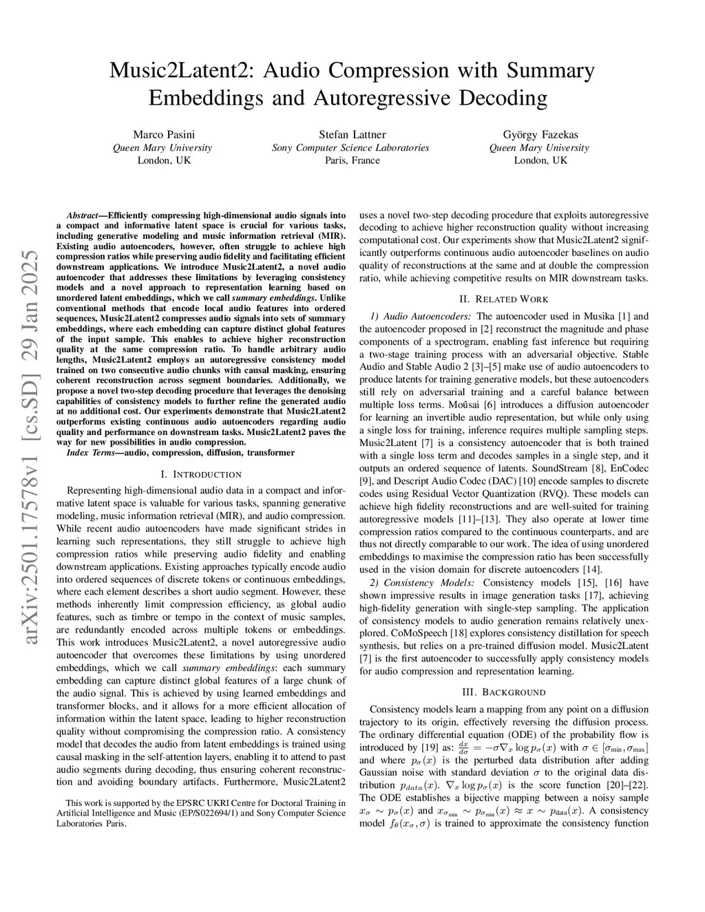 Efficiently compressing high-dimensional audio signals into a compact and informative latent space is crucial for various tasks, including generative modeling and music information retrieval (MIR). Existing audio autoencoders, however, often struggle to achieve high compression ratios while preserving audio fidelity and facilitating efficient downstream applications. We introduce Music2Latent2, a novel audio autoencoder that addresses these limitations by leveraging consistency models and a novel approach to representation learning based on unordered latent embeddings, which we call summary embeddings. Unlike conventional methods that encode local audio features into ordered sequences, Music2Latent2 compresses audio signals into sets of summary embeddings, where each embedding can capture distinct global features of the input sample. This enables to achieve higher reconstruction quality at the same compression ratio. To handle arbitrary audio lengths, Music2Latent2 employs an autoregressive consistency model trained on two consecutive audio chunks with causal masking, ensuring coherent reconstruction across segment boundaries. Additionally, we propose a novel two-step decoding procedure that leverages the denoising capabilities of consistency models to further refine the generated audio at no additional cost. Our experiments demonstrate that Music2Latent2 outperforms existing continuous audio autoencoders regarding audio quality and performance on downstream tasks. Music2Latent2 paves the way for new possibilities in audio compression.