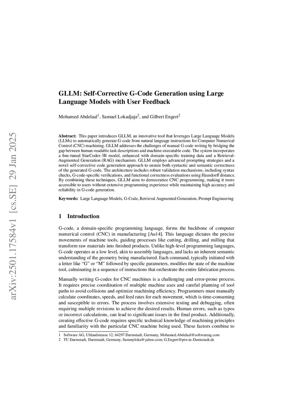 This paper introduces GLLM, an innovative tool that leverages Large Language Models (LLMs) to automatically generate G-code from natural language instructions for Computer Numerical Control (CNC) machining. GLLM addresses the challenges of manual G-code writing by bridging the gap between human-readable task descriptions and machine-executable code. The system incorporates a fine-tuned StarCoder-3B model, enhanced with domain-specific training data and a Retrieval-Augmented Generation (RAG) mechanism. GLLM employs advanced prompting strategies and a novel self-corrective code generation approach to ensure both syntactic and semantic correctness of the generated G-code. The architecture includes robust validation mechanisms, including syntax checks, G-code-specific verifications, and functional correctness evaluations using Hausdorff distance. By combining these techniques, GLLM aims to democratize CNC programming, making it more accessible to users without extensive programming experience while maintaining high accuracy and reliability in G-code generation.
