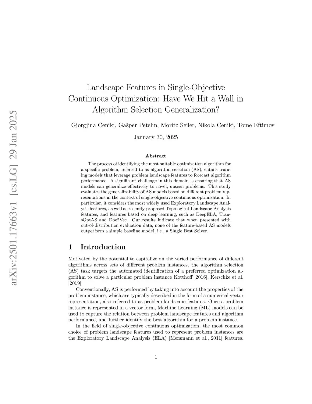 %% Text of abstract The process of identifying the most suitable optimization algorithm for a specific problem, referred to as algorithm selection (AS), entails training models that leverage problem landscape features to forecast algorithm performance. A significant challenge in this domain is ensuring that AS models can generalize effectively to novel, unseen problems. This study evaluates the generalizability of AS models based on different problem representations in the context of single-objective continuous optimization. In particular, it considers the most widely used Exploratory Landscape Analysis features, as well as recently proposed Topological Landscape Analysis features, and features based on deep learning, such as DeepELA, TransOptAS and Doe2Vec. Our results indicate that when presented with out-of-distribution evaluation data, none of the feature-based AS models outperform a simple baseline model, i.e., a Single Best Solver.