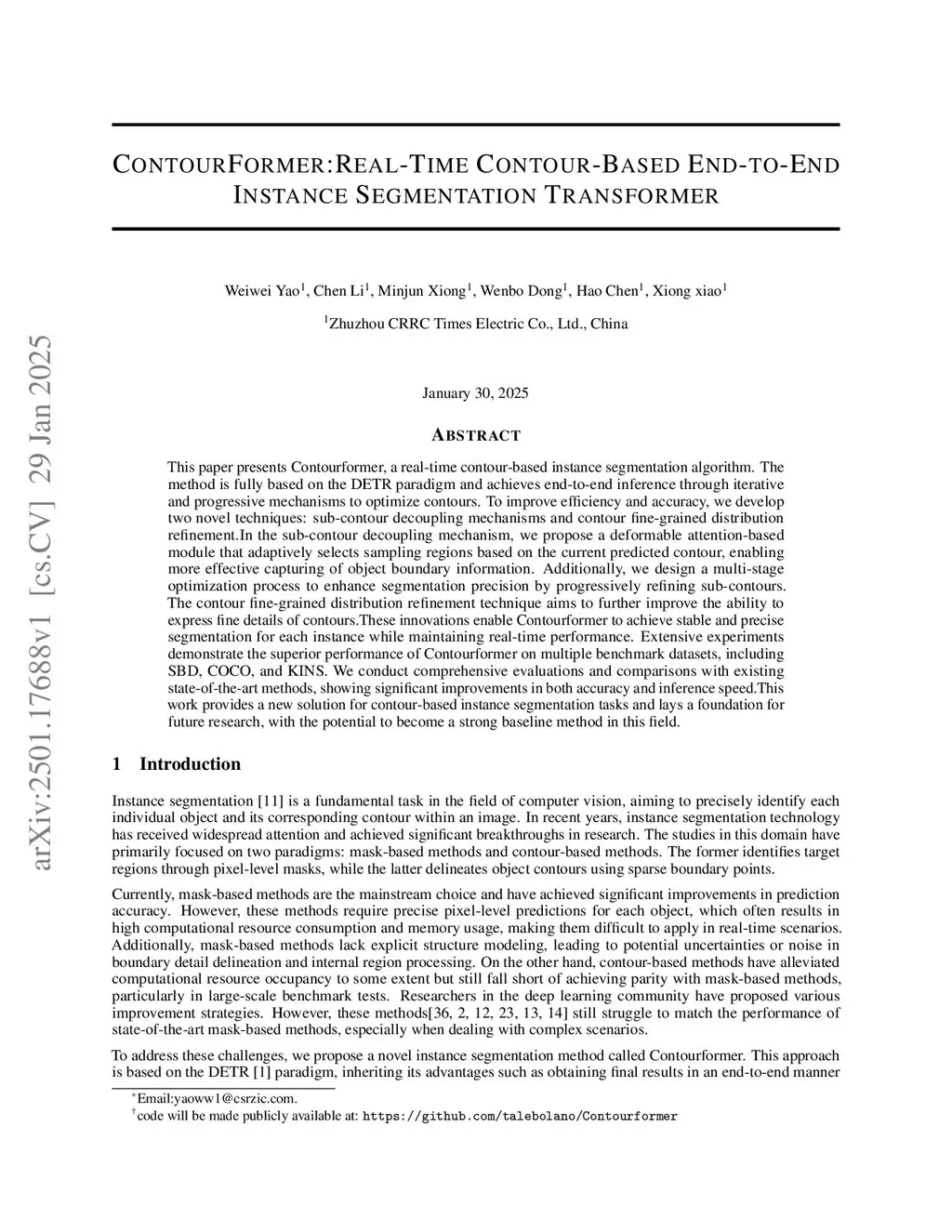 This paper presents Contourformer, a real-time contour-based instance segmentation algorithm. The method is fully based on the DETR paradigm and achieves end-to-end inference through iterative and progressive mechanisms to optimize contours. To improve efficiency and accuracy, we develop two novel techniques: sub-contour decoupling mechanisms and contour fine-grained distribution refinement. In the sub-contour decoupling mechanism, we propose a deformable attention-based module that adaptively selects sampling regions based on the current predicted contour, enabling more effective capturing of object boundary information. Additionally, we design a multi-stage optimization process to enhance segmentation precision by progressively refining sub-contours. The contour fine-grained distribution refinement technique aims to further improve the ability to express fine details of contours. These innovations enable Contourformer to achieve stable and precise segmentation for each instance while maintaining real-time performance. Extensive experiments demonstrate the superior performance of Contourformer on multiple benchmark datasets, including SBD, COCO, and KINS. We conduct comprehensive evaluations and comparisons with existing state-of-the-art methods, showing significant improvements in both accuracy and inference speed. This work provides a new solution for contour-based instance segmentation tasks and lays a foundation for future research, with the potential to become a strong baseline method in this field.