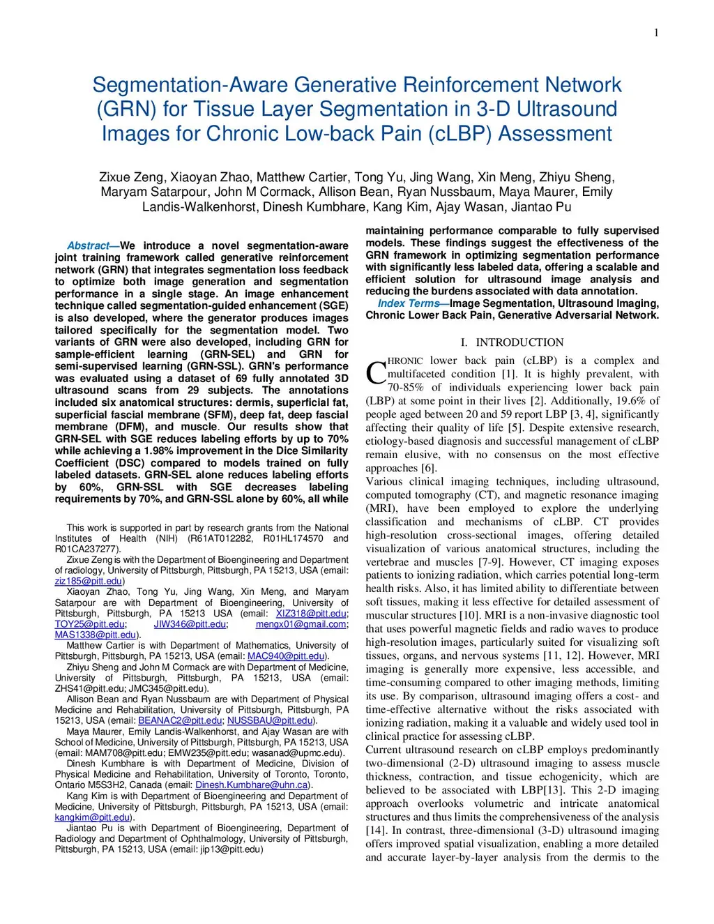 Segmentation-Aware Generative Reinforcement Network (GRN) for Tissue Layer Segmentation in 3-D Ultrasound Images for Chronic Low-back Pain (cLBP) Assessment