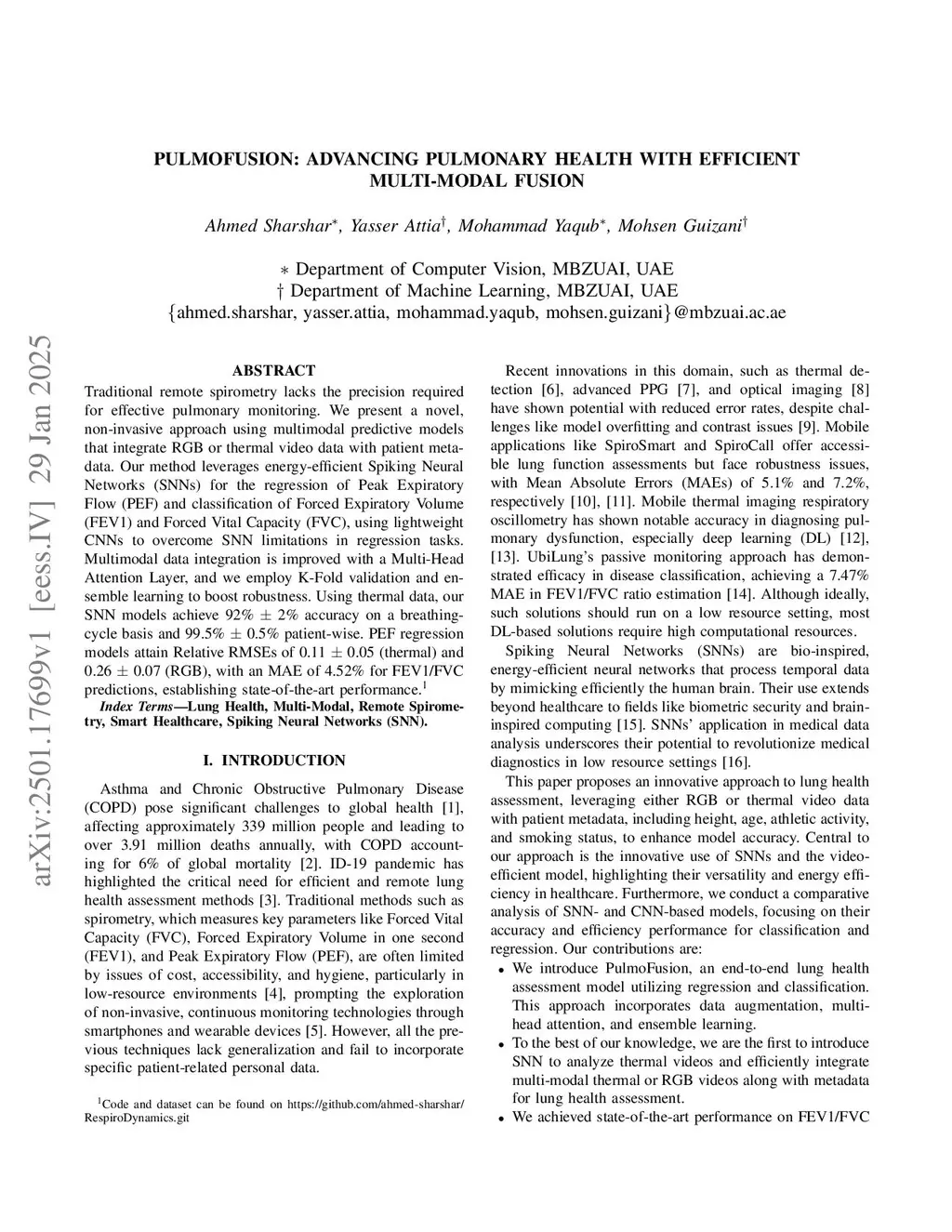 Traditional remote spirometry lacks the precision required for effective pulmonary monitoring. We present a novel, non-invasive approach using multimodal predictive models that integrate RGB or thermal video data with patient metadata. Our method leverages energy-efficient Spiking Neural Networks (SNNs) for the regression of Peak Expiratory Flow (PEF) and classification of Forced Expiratory Volume (FEV1) and Forced Vital Capacity (FVC), using lightweight CNNs to overcome SNN limitations in regression tasks. Multimodal data integration is improved with a Multi-Head Attention Layer, and we employ K-Fold validation and ensemble learning to boost robustness. Using thermal data, our SNN models achieve 92% accuracy on a breathing-cycle basis and 99.5% patient-wise. PEF regression models attain Relative RMSEs of 0.11 (thermal) and 0.26 (RGB), with an MAE of 4.52% for FEV1/FVC predictions, establishing state-of-the-art performance. Code and dataset can be found onthis https URL
