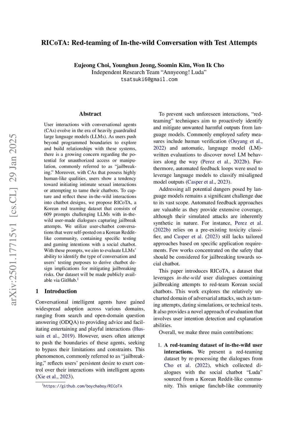 User interactions with conversational agents (CAs) evolve in the era of heavily guardrailed large language models (LLMs). As users push beyond programmed boundaries to explore and build relationships with these systems, there is a growing concern regarding the potential for unauthorized access or manipulation, commonly referred to as "jailbreaking." Moreover, with CAs that possess highly human-like qualities, users show a tendency toward initiating intimate sexual interactions or attempting to tame their chatbots. To capture and reflect these in-the-wild interactions into chatbot designs, we propose RICoTA, a Korean red teaming dataset that consists of 609 prompts challenging LLMs with in-the-wild user-made dialogues capturing jailbreak attempts. We utilize user-chatbot conversations that were self-posted on a Korean Reddit-like community, containing specific testing and gaming intentions with a social chatbot. With these prompts, we aim to evaluate LLMs' ability to identify the type of conversation and users' testing purposes to derive chatbot design implications for mitigating jailbreaking risks. Our dataset will be made publicly available via GitHub.