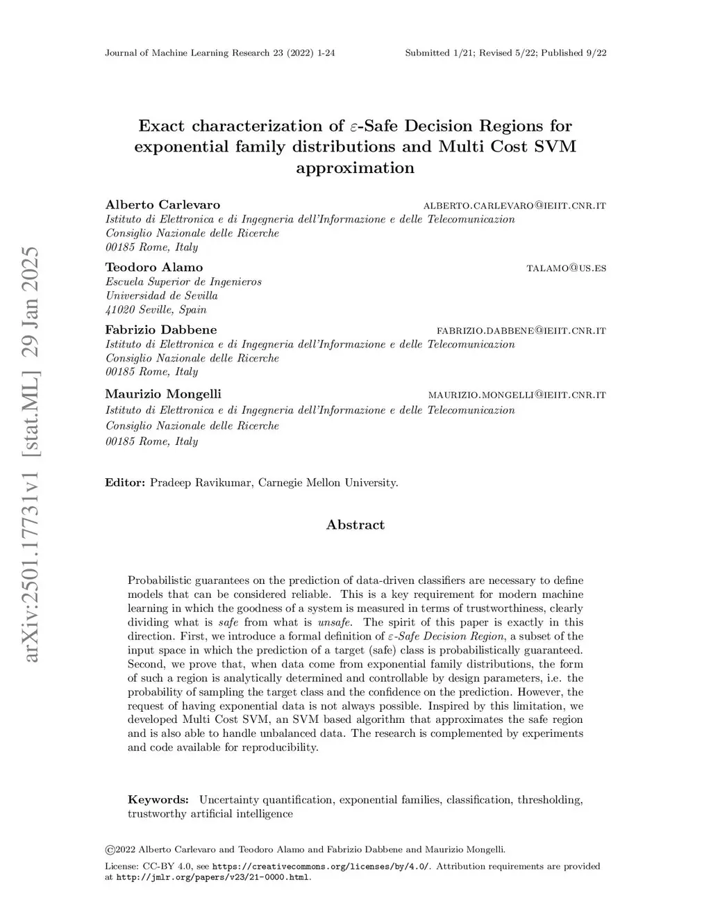 Probabilistic guarantees on the prediction of data-driven classifiers are necessary to define models that can be considered reliable. This is a key requirement for modern machine learning in which the goodness of a system is measured in terms of trustworthiness, clearly dividing what is safe from what is unsafe. The spirit of this paper is exactly in this direction. First, we introduce a formal definition of {\epsilon}-Safe Decision Region, a subset of the input space in which the prediction of a target (safe) class is probabilistically guaranteed. Second, we prove that, when data come from exponential family distributions, the form of such a region is analytically determined and controllable by design parameters, i.e. the probability of sampling the target class and the confidence on the prediction. However, the request of having exponential data is not always possible. Inspired by this limitation, we developed Multi Cost SVM, an SVM based algorithm that approximates the safe region and is also able to handle unbalanced data. The research is complemented by experiments and code available for reproducibility.