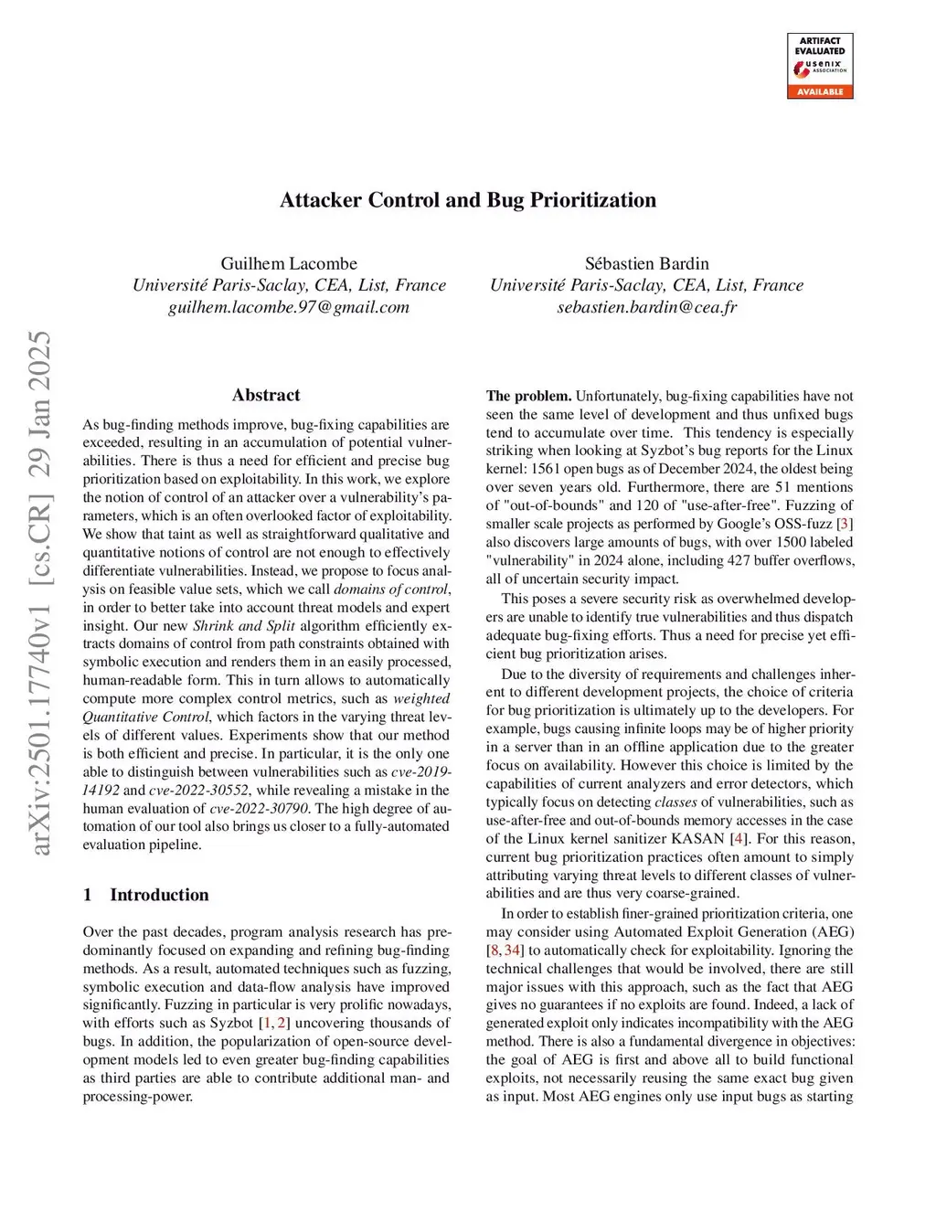 As bug-finding methods improve, bug-fixing capabilities are exceeded, resulting in an accumulation of potential vulnerabilities. There is thus a need for efficient and precise bug prioritization based on exploitability. In this work, we explore the notion of control of an attacker over a vulnerability's parameters, which is an often overlooked factor of exploitability. We show that taint as well as straightforward qualitative and quantitative notions of control are not enough to effectively differentiate vulnerabilities. Instead, we propose to focus analysis on feasible value sets, which we call domains of control, in order to better take into account threat models and expert insight. Our new Shrink and Split algorithm efficiently extracts domains of control from path constraints obtained with symbolic execution and renders them in an easily processed, human-readable form. This in turn allows to automatically compute more complex control metrics, such as weighted Quantitative Control, which factors in the varying threat levels of different values. Experiments show that our method is both efficient and precise. In particular, it is the only one able to distinguish between vulnerabilities such as cve-2019-14192 and cve-2022-30552, while revealing a mistake in the human evaluation of cve-2022-30790. The high degree of automation of our tool also brings us closer to a fully-automated evaluation pipeline.
