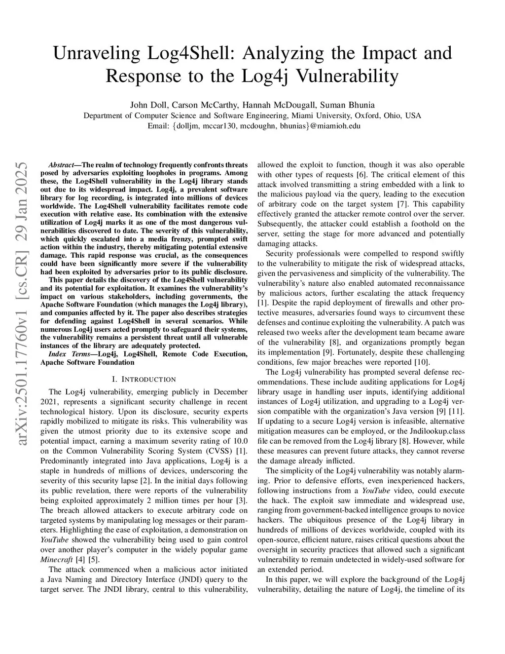 The realm of technology frequently confronts threats posed by adversaries exploiting loopholes in programs. Among these, the Log4Shell vulnerability in the Log4j library stands out due to its widespread impact. Log4j, a prevalent software library for log recording, is integrated into millions of devices worldwide. The Log4Shell vulnerability facilitates remote code execution with relative ease. Its combination with the extensive utilization of Log4j marks it as one of the most dangerous vulnerabilities discovered to date. The severity of this vulnerability, which quickly escalated into a media frenzy, prompted swift action within the industry, thereby mitigating potential extensive damage. This rapid response was crucial, as the consequences could have been significantly more severe if the vulnerability had been exploited by adversaries prior to its public disclosure.This paper details the discovery of the Log4Shell vulnerability and its potential for exploitation. It examines the vulnerability's impact on various stakeholders, including governments, the Apache Software Foundation (which manages the Log4j library), and companies affected by it. The paper also describes strategies for defending against Log4Shell in several scenarios. While numerous Log4j users acted promptly to safeguard their systems, the vulnerability remains a persistent threat until all vulnerable instances of the library are adequately protected.