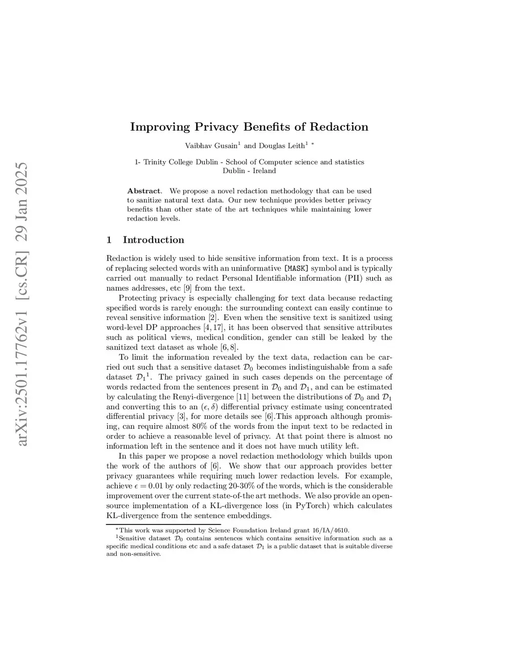 We propose a novel redaction methodology that can be used to sanitize natural text data. Our new technique provides better privacy benefits than other state of the art techniques while maintaining lower redaction levels.