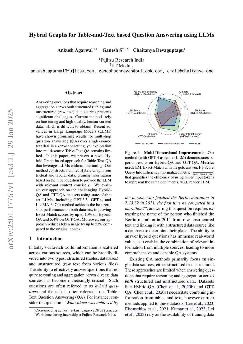 Hybrid Graphs for Table-and-Text based Question Answering using LLMs