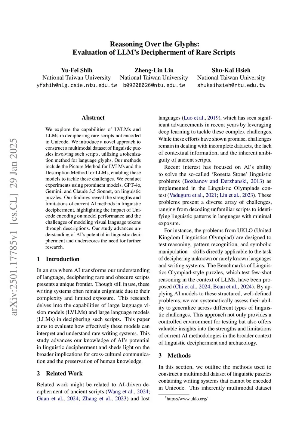 We explore the capabilities of LVLMs and LLMs in deciphering rare scripts not encoded in Unicode. We introduce a novel approach to construct a multimodal dataset of linguistic puzzles involving such scripts, utilizing a tokenization method for language glyphs. Our methods include the Picture Method for LVLMs and the Description Method for LLMs, enabling these models to tackle these challenges. We conduct experiments using prominent models, GPT-4o, Gemini, and Claude 3.5 Sonnet, on linguistic puzzles. Our findings reveal the strengths and limitations of current AI methods in linguistic decipherment, highlighting the impact of Unicode encoding on model performance and the challenges of modeling visual language tokens through descriptions. Our study advances understanding of AI's potential in linguistic decipherment and underscores the need for further research.