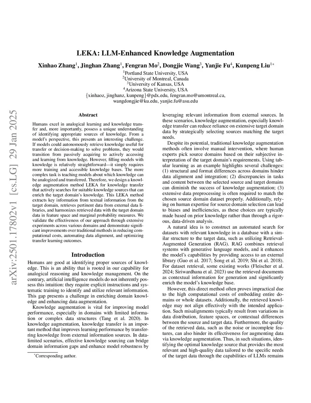 Humans excel in analogical learning and knowledge transfer and, more importantly, possess a unique understanding of identifying appropriate sources of knowledge. From a model's perspective, this presents an interesting challenge. If models could autonomously retrieve knowledge useful for transfer or decision-making to solve problems, they would transition from passively acquiring to actively accessing and learning from knowledge. However, filling models with knowledge is relatively straightforward -- it simply requires more training and accessible knowledge bases. The more complex task is teaching models about which knowledge can be analogized and transferred. Therefore, we design a knowledge augmentation method, LEKA, for knowledge transfer that actively searches for suitable knowledge sources that can enrich the target domain's knowledge. This LEKA method extracts key information from the target domain's textual information, retrieves pertinent data from external data libraries, and harmonizes retrieved data with the target domain data in feature space and marginal probability measures. We validate the effectiveness of our approach through extensive experiments across various domains and demonstrate significant improvements over traditional methods in reducing computational costs, automating data alignment, and optimizing transfer learning outcomes.