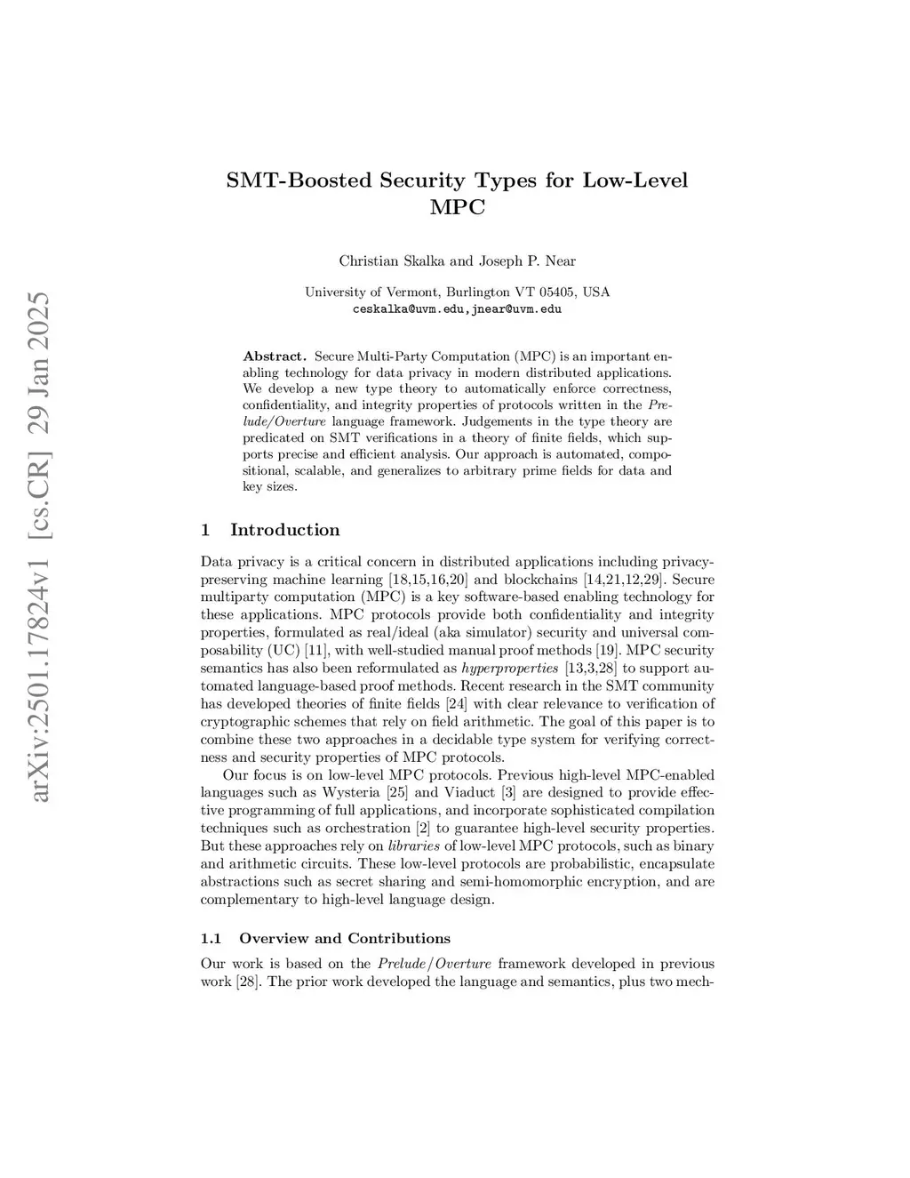Secure Multi-Party Computation (MPC) is an important enabling technology for data privacy in modern distributed applications. We develop a new type theory to automatically enforce correctness,confidentiality, and integrity properties of protocols written in the \emph{Prelude/Overture} language framework. Judgements in the type theory are predicated on SMT verifications in a theory of finite fields, which supports precise and efficient analysis. Our approach is automated, compositional, scalable, and generalizes to arbitrary prime fields for data and key sizes.