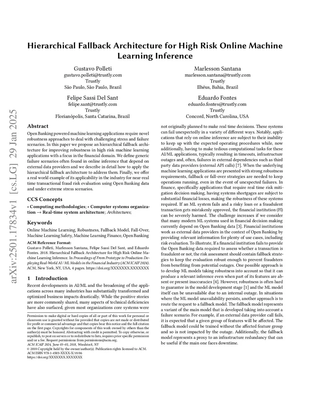 Open Banking powered machine learning applications require novel robustness approaches to deal with challenging stress and failure scenarios. In this paper we propose an hierarchical fallback architecture for improving robustness in high risk machine learning applications with a focus in the financial domain. We define generic failure scenarios often found in online inference that depend on external data providers and we describe in detail how to apply the hierarchical fallback architecture to address them. Finally, we offer a real world example of its applicability in the industry for near-real time transactional fraud risk evaluation using Open Banking data and under extreme stress scenarios.