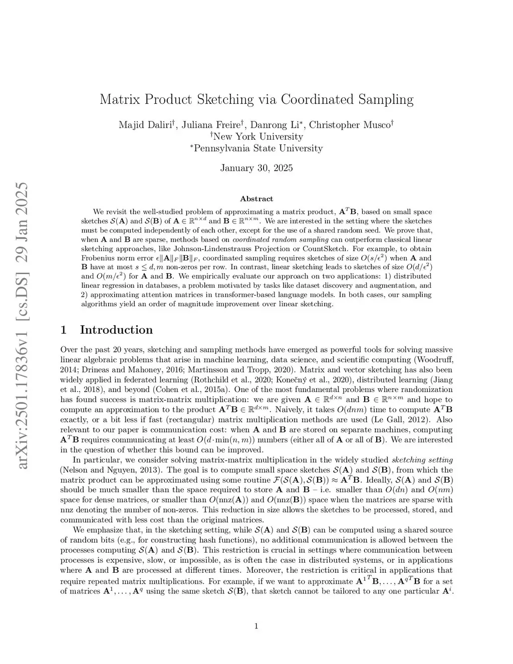 We revisit the well-studied problem of approximating a matrix product, , based on small space sketches and of and . We are interested in the setting where the sketches must be computed independently of each other, except for the use of a shared random seed. We prove that, when and are sparse, methods based on \emph{coordinated random sampling} can outperform classical linear sketching approaches, like Johnson-Lindenstrauss Projection or CountSketch. For example, to obtain Frobenius norm error , coordinated sampling requires sketches of size when and have at most non-zeros per row. In contrast, linear sketching leads to sketches of size and for and . We empirically evaluate our approach on two applications: 1) distributed linear regression in databases, a problem motivated by tasks like dataset discovery and augmentation, and 2) approximating attention matrices in transformer-based language models. In both cases, our sampling algorithms yield an order of magnitude improvement over linear sketching.