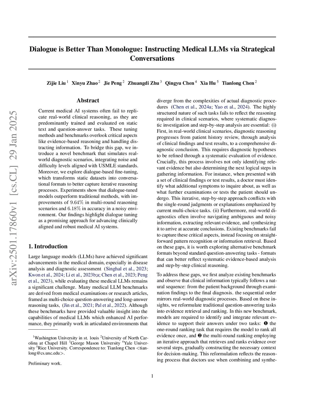 Current medical AI systems often fail to replicate real-world clinical reasoning, as they are predominantly trained and evaluated on static text and question-answer tasks. These tuning methods and benchmarks overlook critical aspects like evidence-based reasoning and handling distracting information. To bridge this gap, we introduce a novel benchmark that simulates real-world diagnostic scenarios, integrating noise and difficulty levels aligned with USMLE standards. Moreover, we explore dialogue-based fine-tuning, which transforms static datasets into conversational formats to better capture iterative reasoning processes. Experiments show that dialogue-tuned models outperform traditional methods, with improvements of in multi-round reasoning scenarios and in accuracy in a noisy environment. Our findings highlight dialogue tuning as a promising approach for advancing clinically aligned and robust medical AI systems.
