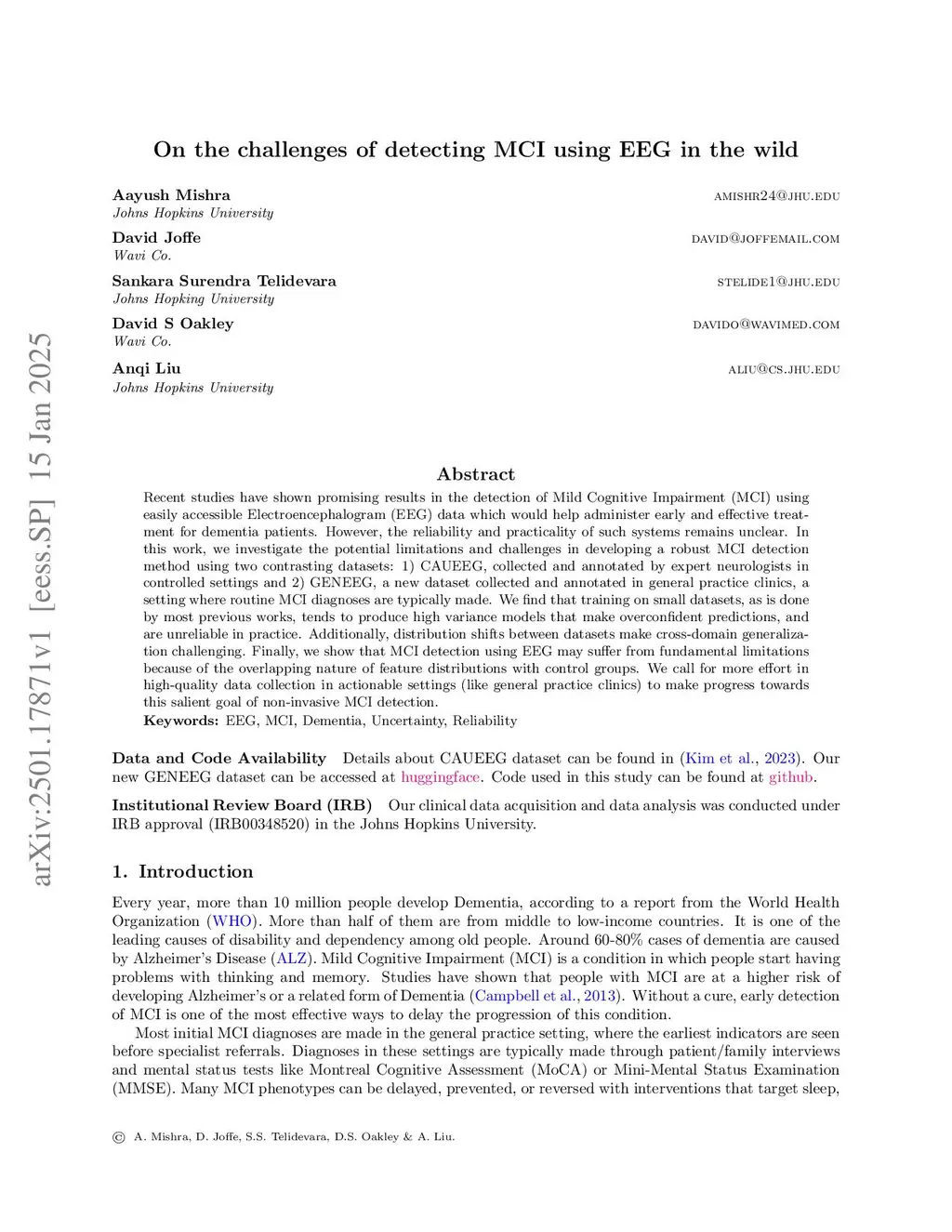 Recent studies have shown promising results in the detection of Mild Cognitive Impairment (MCI) using easily accessible Electroencephalogram (EEG) data which would help administer early and effective treatment for dementia patients. However, the reliability and practicality of such systems remains unclear. In this work, we investigate the potential limitations and challenges in developing a robust MCI detection method using two contrasting datasets: 1) CAUEEG, collected and annotated by expert neurologists in controlled settings and 2) GENEEG, a new dataset collected and annotated in general practice clinics, a setting where routine MCI diagnoses are typically made. We find that training on small datasets, as is done by most previous works, tends to produce high variance models that make overconfident predictions, and are unreliable in practice. Additionally, distribution shifts between datasets make cross-domain generalization challenging. Finally, we show that MCI detection using EEG may suffer from fundamental limitations because of the overlapping nature of feature distributions with control groups. We call for more effort in high-quality data collection in actionable settings (like general practice clinics) to make progress towards this salient goal of non-invasive MCI detection.
