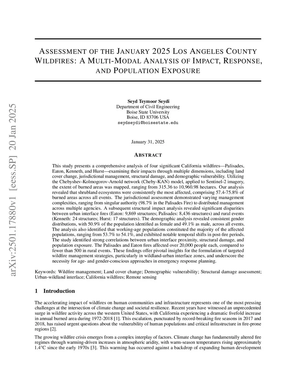 This study presents a comprehensive analysis of four significant California wildfires: Palisades, Eaton, Kenneth, and Hurst, examining their impacts through multiple dimensions, including land cover change, jurisdictional management, structural damage, and demographic vulnerability. Using the Chebyshev-Kolmogorov-Arnold network model applied to Sentinel-2 imagery, the extent of burned areas was mapped, ranging from 315.36 to 10,960.98 hectares. Our analysis revealed that shrubland ecosystems were consistently the most affected, comprising 57.4-75.8% of burned areas across all events. The jurisdictional assessment demonstrated varying management complexities, from singular authority (98.7% in the Palisades Fire) to distributed management across multiple agencies. A structural impact analysis revealed significant disparities between urban interface fires (Eaton: 9,869 structures; Palisades: 8,436 structures) and rural events (Kenneth: 24 structures; Hurst: 17 structures). The demographic analysis showed consistent gender distributions, with 50.9% of the population identified as female and 49.1% as male. Working-age populations made up the majority of the affected populations, ranging from 53.7% to 54.1%, with notable temporal shifts in post-fire periods. The study identified strong correlations between urban interface proximity, structural damage, and population exposure. The Palisades and Eaton fires affected over 20,000 people each, compared to fewer than 500 in rural events. These findings offer valuable insights for the development of targeted wildfire management strategies, particularly in wildland urban interface zones, and emphasize the need for age- and gender-conscious approaches in emergency response planning.