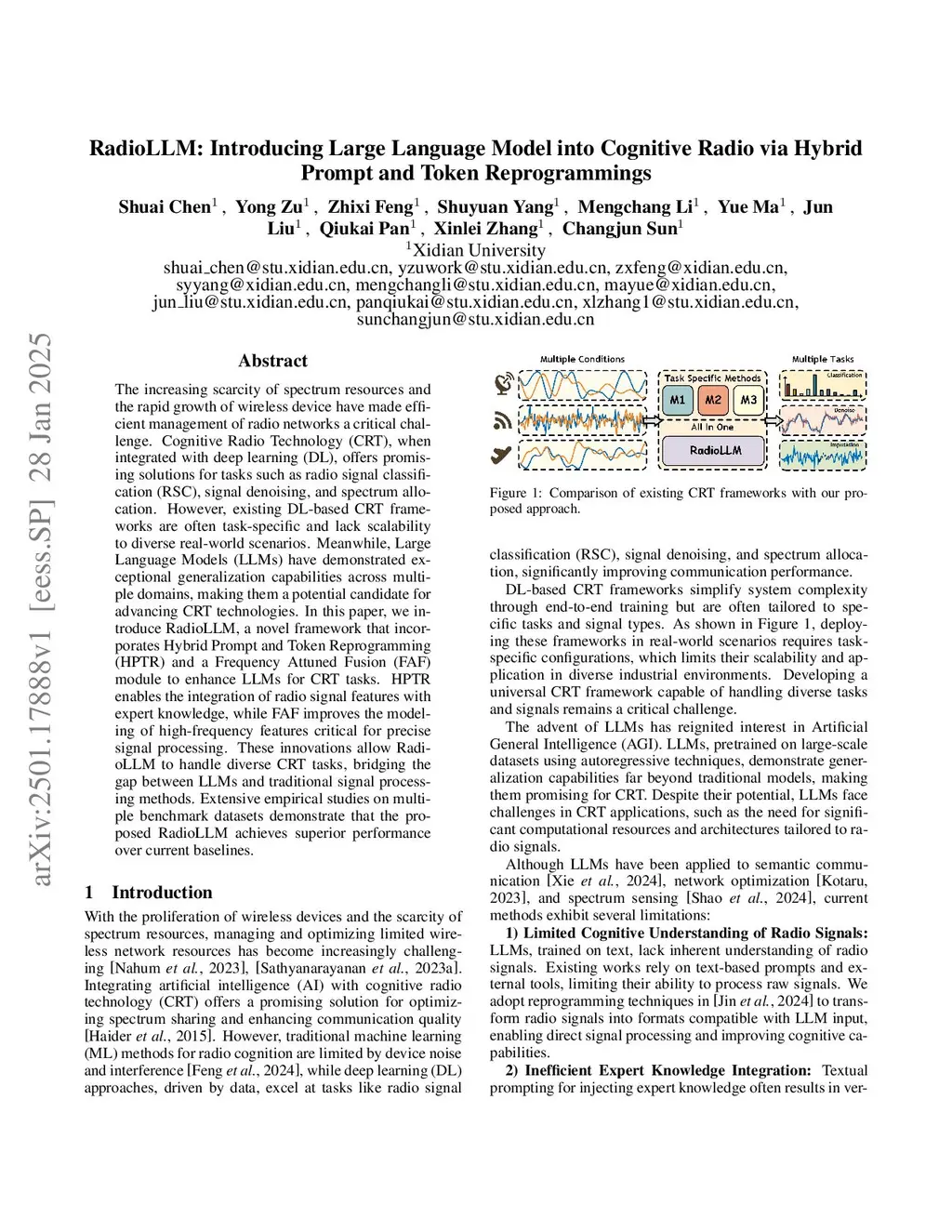 The growing scarcity of spectrum resources and rapid proliferation of wireless devices make efficient radio network management critical. While deep learning-enhanced Cognitive Radio Technology (CRT) provides promising solutions for tasks such as radio signal classification (RSC), denoising, and spectrum allocation, existing DL-based CRT frameworks are typically task-specific and lack scalability in diverse real-world applications. This limitation naturally leads to the exploration of Large Language Models (LLMs), whose exceptional cross-domain generalization capabilities offer new potential for advancing CRT. To bridge this gap, we propose RadioLLM, a novel framework that integrates Hybrid Prompt and Token Reprogramming (HPTR) for combining radio signal features with expert knowledge, and a Frequency-Attuned Fusion (FAF) module for enhanced high-frequency feature modeling. Extensive evaluations on multiple benchmark datasets demonstrate that RadioLLM achieves superior performance compared to existing baselines in the majority of testing scenarios.