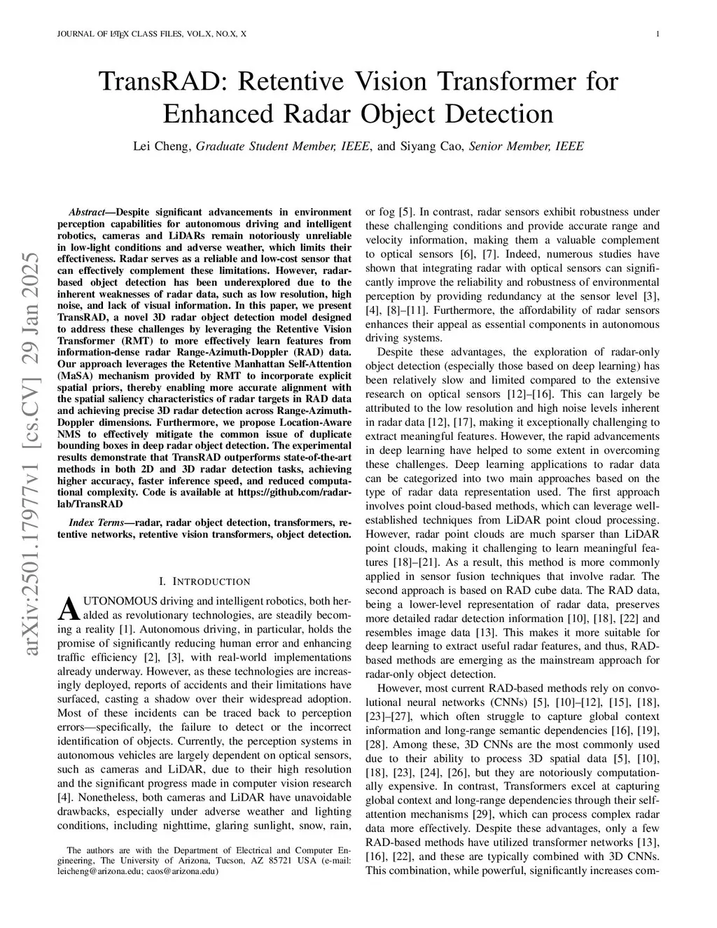 TransRAD: Retentive Vision Transformer for Enhanced Radar Object Detection
