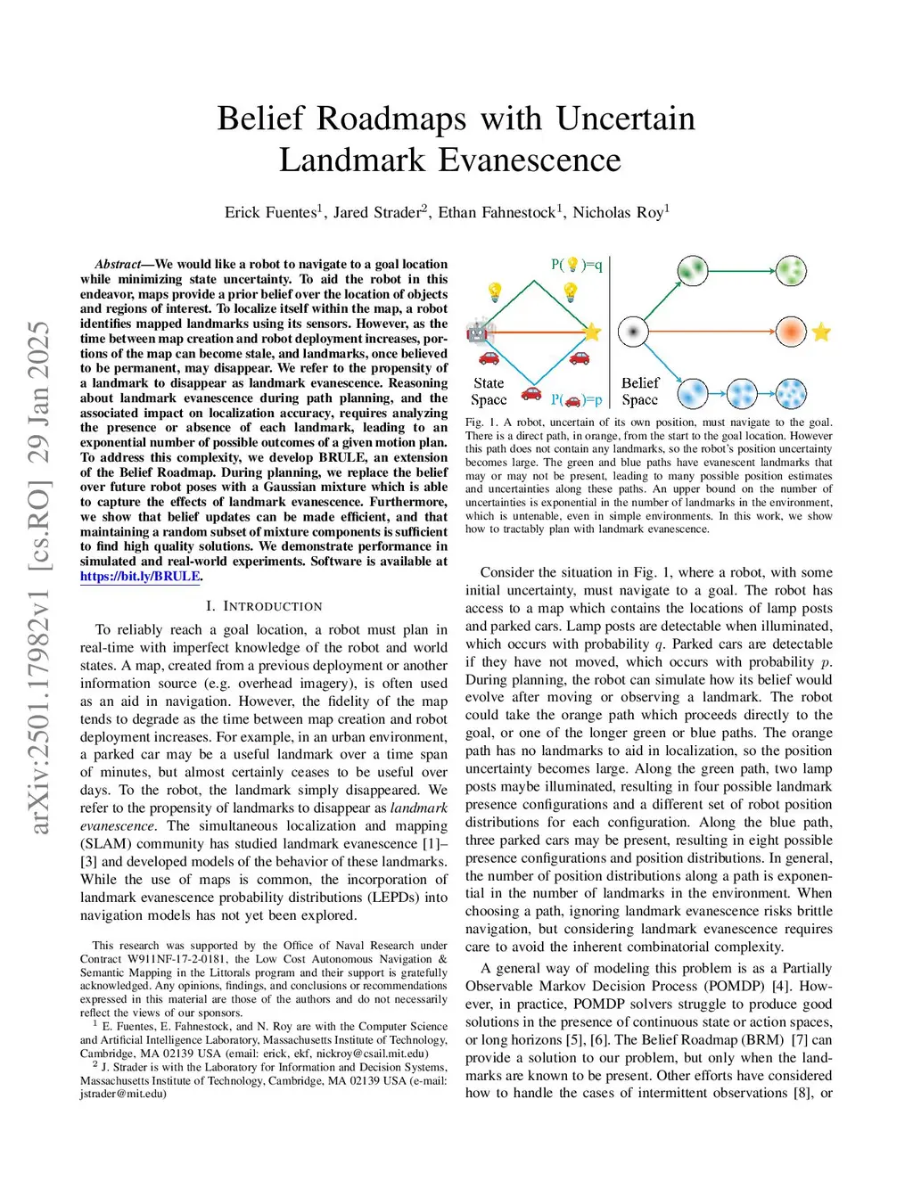 We would like a robot to navigate to a goal location while minimizing state uncertainty. To aid the robot in this endeavor, maps provide a prior belief over the location of objects and regions of interest. To localize itself within the map, a robot identifies mapped landmarks using its sensors. However, as the time between map creation and robot deployment increases, portions of the map can become stale, and landmarks, once believed to be permanent, may disappear. We refer to the propensity of a landmark to disappear as landmark evanescence. Reasoning about landmark evanescence during path planning, and the associated impact on localization accuracy, requires analyzing the presence or absence of each landmark, leading to an exponential number of possible outcomes of a given motion plan. To address this complexity, we develop BRULE, an extension of the Belief Roadmap. During planning, we replace the belief over future robot poses with a Gaussian mixture which is able to capture the effects of landmark evanescence. Furthermore, we show that belief updates can be made efficient, and that maintaining a random subset of mixture components is sufficient to find high quality solutions. We demonstrate performance in simulated and real-world experiments. Software is available atthis https URL.