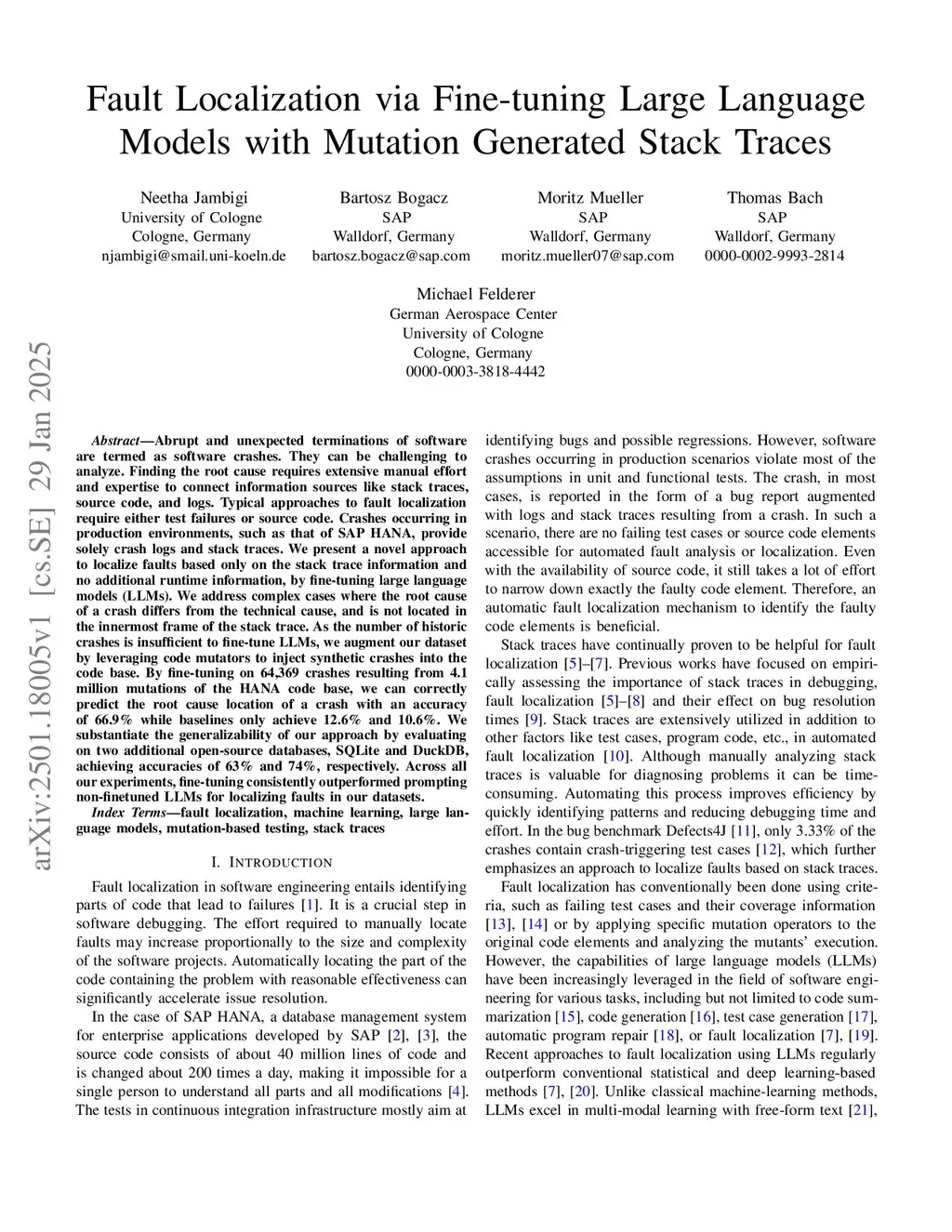 Abrupt and unexpected terminations of software are termed as software crashes. They can be challenging to analyze. Finding the root cause requires extensive manual effort and expertise to connect information sources like stack traces, source code, and logs. Typical approaches to fault localization require either test failures or source code. Crashes occurring in production environments, such as that of SAP HANA, provide solely crash logs and stack traces. We present a novel approach to localize faults based only on the stack trace information and no additional runtime information, by fine-tuning large language models (LLMs). We address complex cases where the root cause of a crash differs from the technical cause, and is not located in the innermost frame of the stack trace. As the number of historic crashes is insufficient to fine-tune LLMs, we augment our dataset by leveraging code mutators to inject synthetic crashes into the code base. By fine-tuning on 64,369 crashes resulting from 4.1 million mutations of the HANA code base, we can correctly predict the root cause location of a crash with an accuracy of 66.9\% while baselines only achieve 12.6% and 10.6%. We substantiate the generalizability of our approach by evaluating on two additional open-source databases, SQLite and DuckDB, achieving accuracies of 63% and 74%, respectively. Across all our experiments, fine-tuning consistently outperformed prompting non-finetuned LLMs for localizing faults in our datasets.