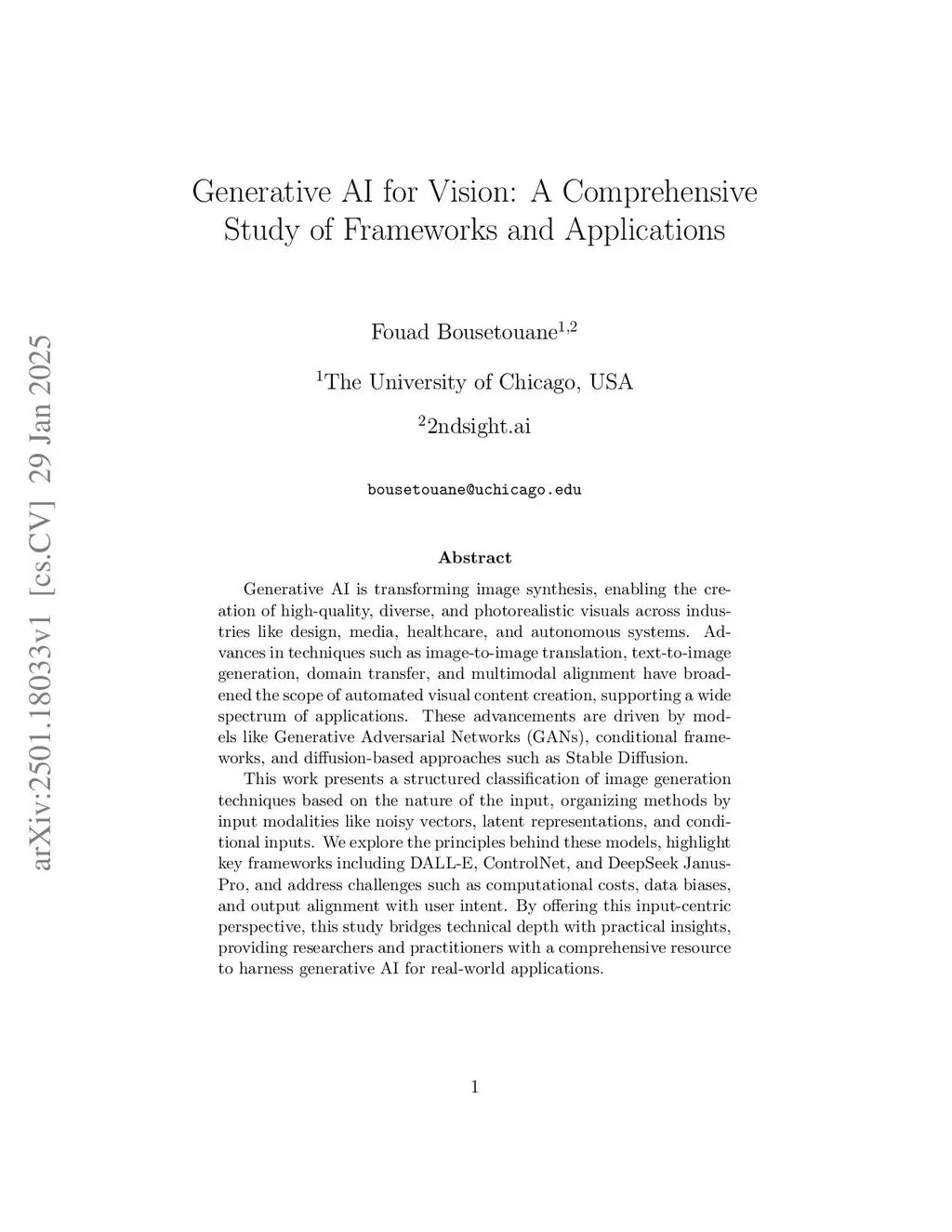 Generative AI for Vision: A Comprehensive Study of Frameworks and Applications