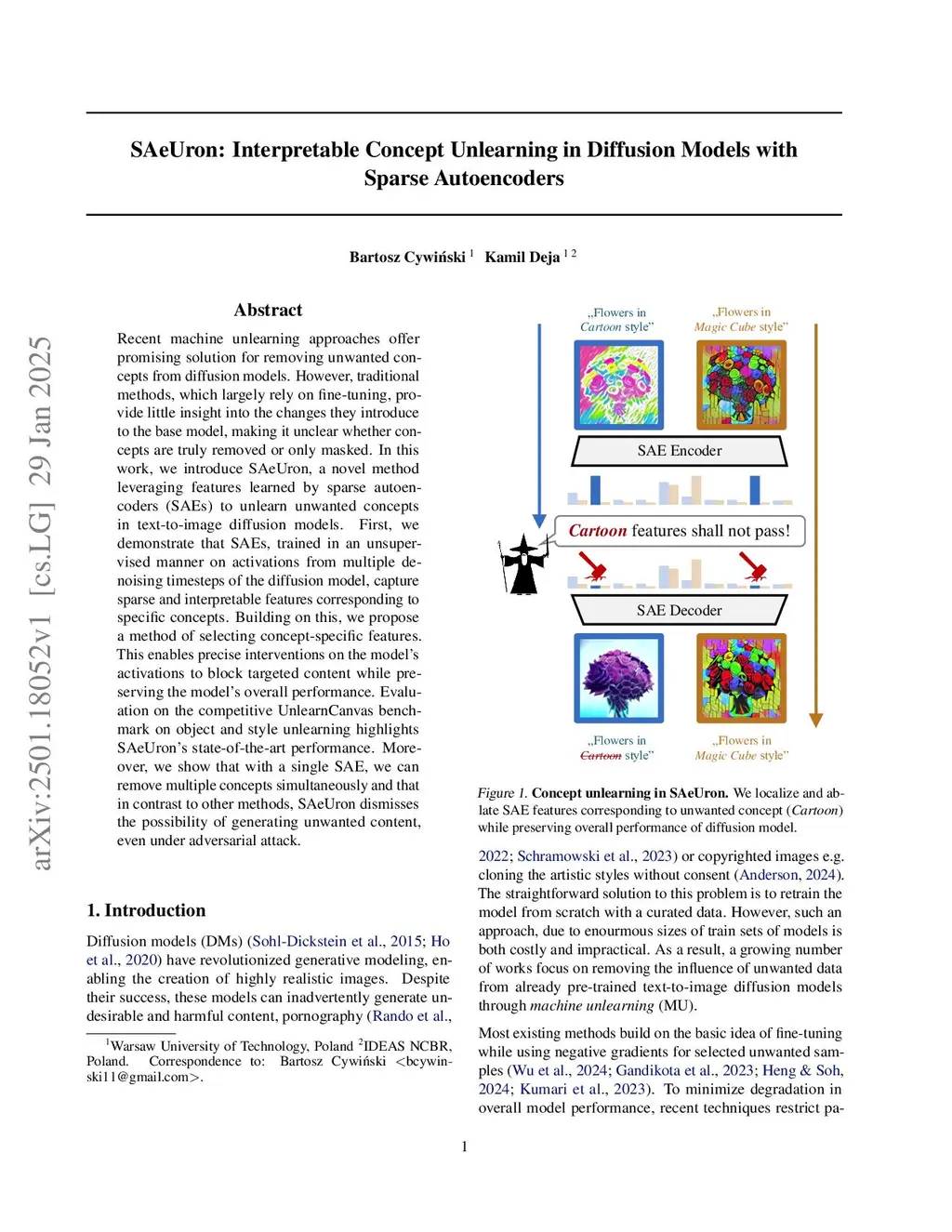 Diffusion models, while powerful, can inadvertently generate harmful or undesirable content, raising significant ethical and safety concerns. Recent machine unlearning approaches offer potential solutions but often lack transparency, making it difficult to understand the changes they introduce to the base model. In this work, we introduce SAeUron, a novel method leveraging features learned by sparse autoencoders (SAEs) to remove unwanted concepts in text-to-image diffusion models. First, we demonstrate that SAEs, trained in an unsupervised manner on activations from multiple denoising timesteps of the diffusion model, capture sparse and interpretable features corresponding to specific concepts. Building on this, we propose a feature selection method that enables precise interventions on model activations to block targeted content while preserving overall performance. Our evaluation shows that SAeUron outperforms existing approaches on the UnlearnCanvas benchmark for concepts and style unlearning, and effectively eliminates nudity when evaluated with I2P. Moreover, we show that with a single SAE, we can remove multiple concepts simultaneously and that in contrast to other methods, SAeUron mitigates the possibility of generating unwanted content under adversarial attack. Code and checkpoints are available atthis https URL.