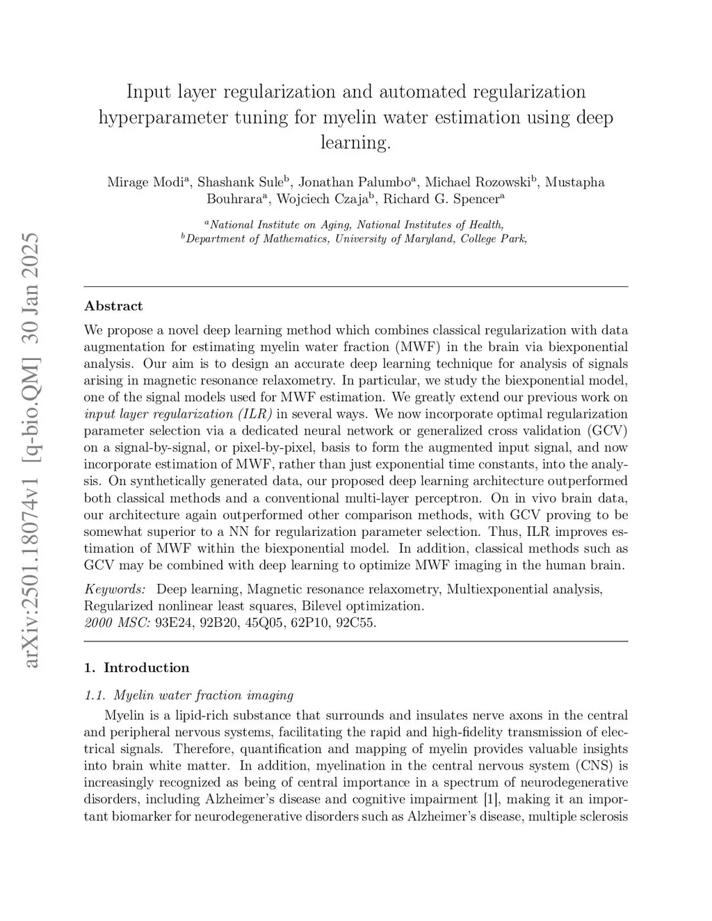 Input layer regularization and automated regularization hyperparameter tuning for myelin water estimation using deep learning
