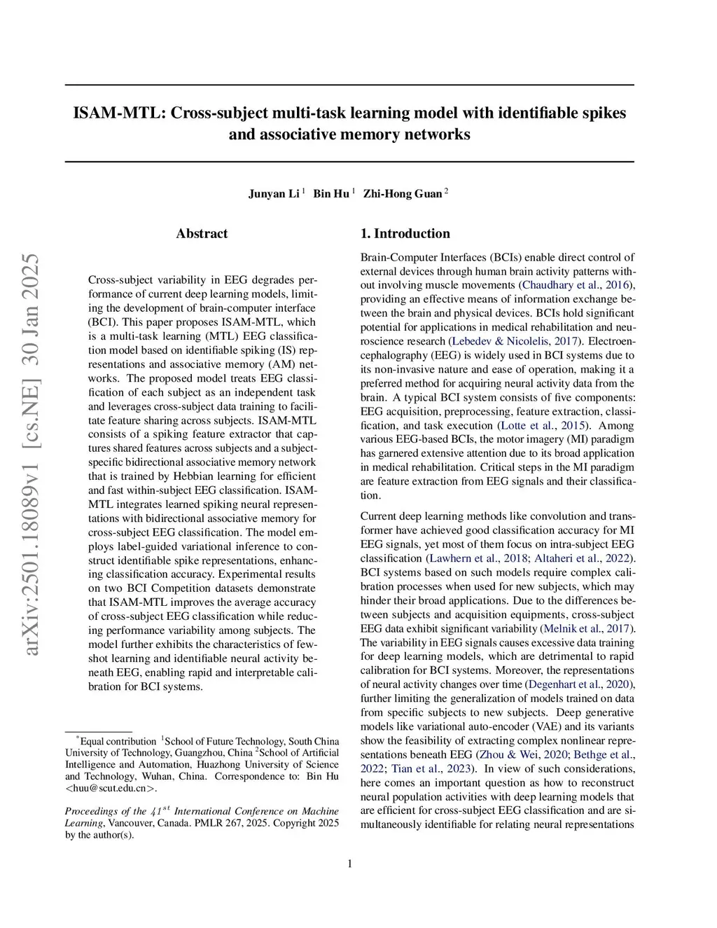 ISAM-MTL: Cross-subject multi-task learning model with identifiable spikes and associative memory networks