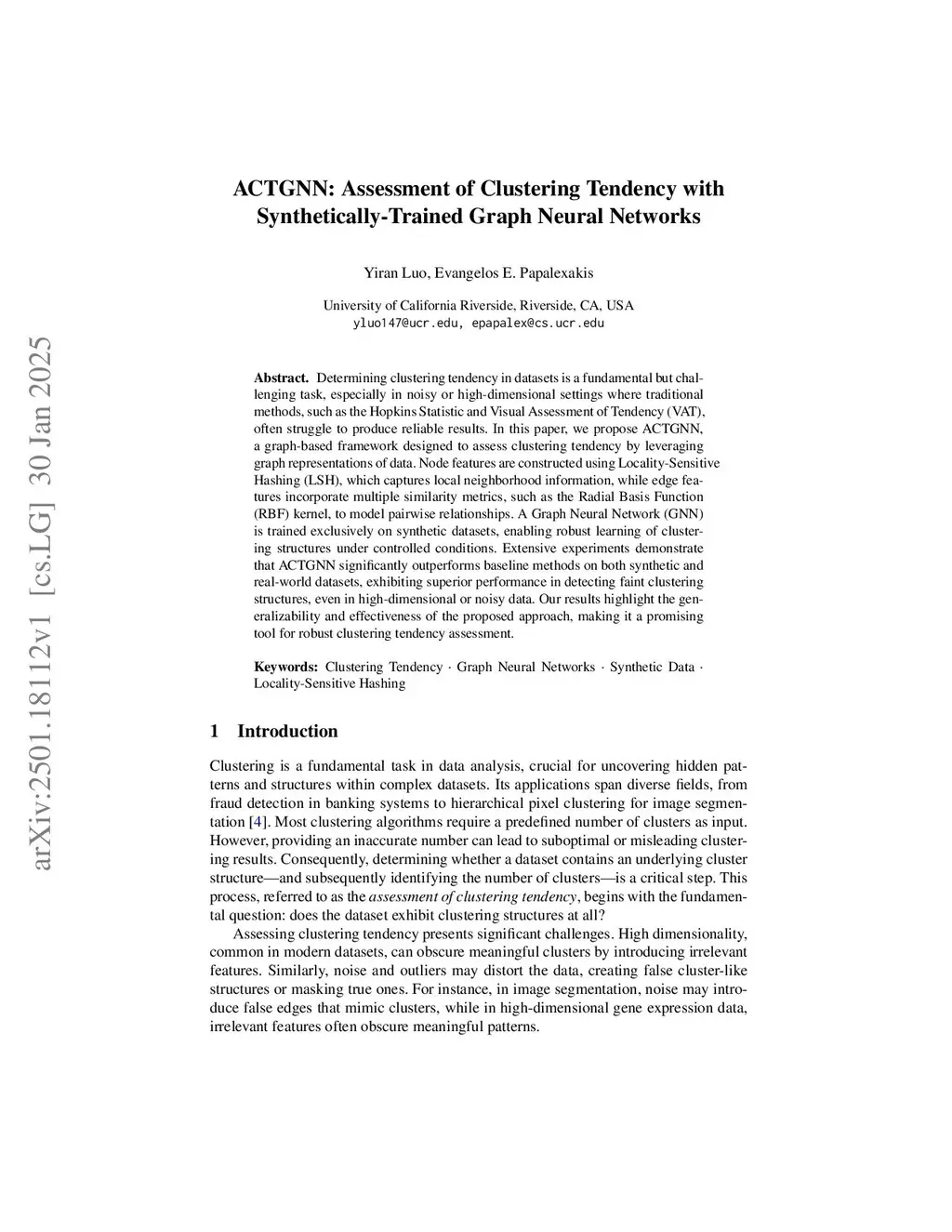 Determining clustering tendency in datasets is a fundamental but challenging task, especially in noisy or high-dimensional settings where traditional methods, such as the Hopkins Statistic and Visual Assessment of Tendency (VAT), often struggle to produce reliable results. In this paper, we propose ACTGNN, a graph-based framework designed to assess clustering tendency by leveraging graph representations of data. Node features are constructed using Locality-Sensitive Hashing (LSH), which captures local neighborhood information, while edge features incorporate multiple similarity metrics, such as the Radial Basis Function (RBF) kernel, to model pairwise relationships. A Graph Neural Network (GNN) is trained exclusively on synthetic datasets, enabling robust learning of clustering structures under controlled conditions. Extensive experiments demonstrate that ACTGNN significantly outperforms baseline methods on both synthetic and real-world datasets, exhibiting superior performance in detecting faint clustering structures, even in high-dimensional or noisy data. Our results highlight the generalizability and effectiveness of the proposed approach, making it a promising tool for robust clustering tendency assessment.