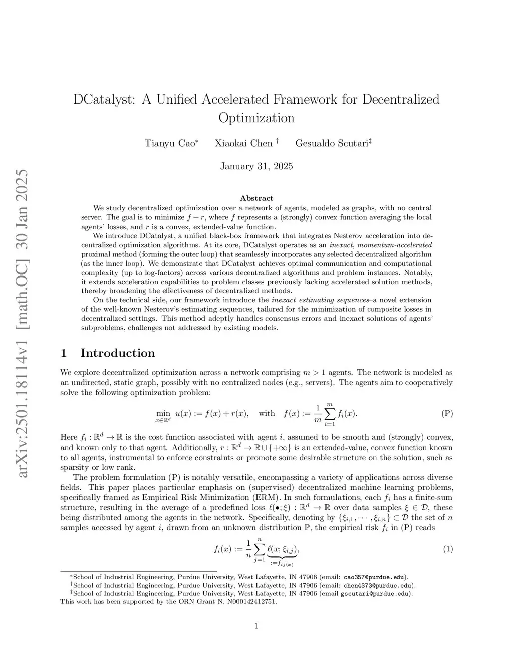We study decentralized optimization over a network of agents, modeled as graphs, with no central server. The goal is to minimize , where represents a (strongly) convex function averaging the local agents' losses, and is a convex, extended-value function.We introduce DCatalyst, a unified black-box framework that integrates Nesterov acceleration into decentralized optimization algorithms. %, enhancing their performance. At its core, DCatalyst operates as an \textit{inexact}, \textit{momentum-accelerated} proximal method (forming the outer loop) that seamlessly incorporates any selected decentralized algorithm (as the inner loop). We demonstrate that DCatalyst achieves optimal communication and computational complexity (up to log-factors) across various decentralized algorithms and problem instances. Notably, it extends acceleration capabilities to problem classes previously lacking accelerated solution methods, thereby broadening the effectiveness of decentralized methods.On the technical side, our framework introduce the {\it inexact estimating sequences}--a novel extension of the well-known Nesterov's estimating sequences, tailored for the minimization of composite losses in decentralized settings. This method adeptly handles consensus errors and inexact solutions of agents' subproblems, challenges not addressed by existing models.