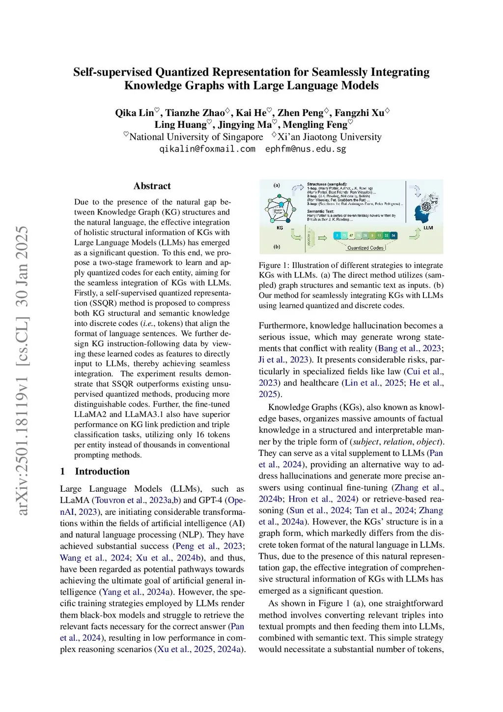 Self-supervised Quantized Representation for Seamlessly Integrating Knowledge Graphs with Large Language Models