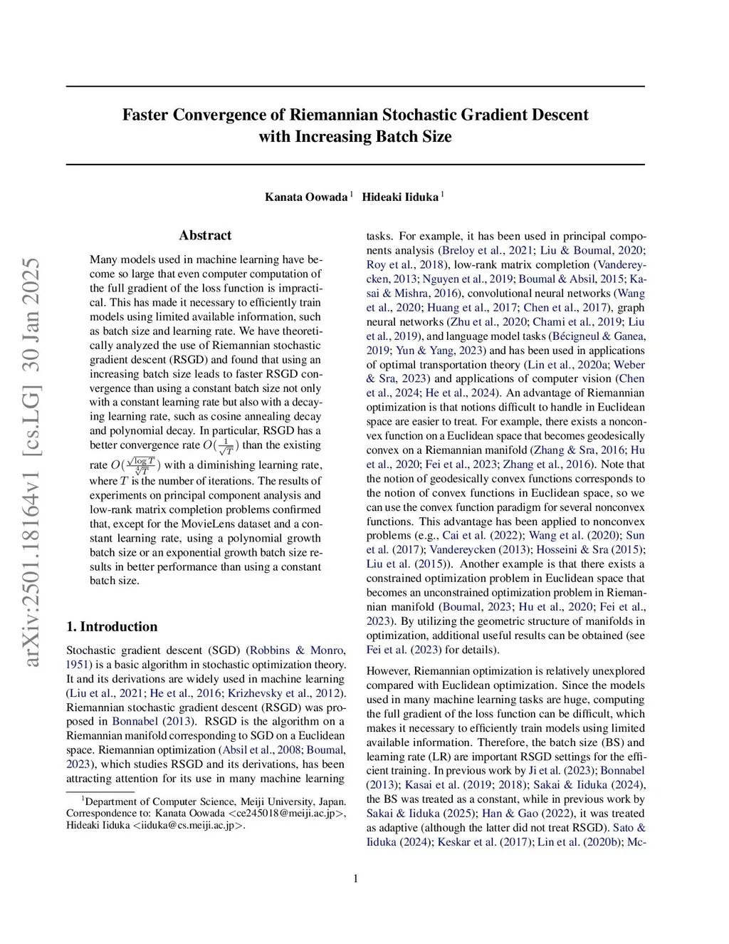 We theoretically analyzed the convergence behavior of Riemannian stochastic gradient descent (RSGD) and found that using an increasing batch size leads to faster convergence than using a constant batch size, not only with a constant learning rate but also with a decaying learning rate, such as cosine annealing decay and polynomial decay. The convergence rate improves from with a constant batch size to with an increasing batch size, where denotes the total number of iterations and is a constant. Using principal component analysis and low-rank matrix completion, we investigated, both theoretically and numerically, how an increasing batch size affects computational time as quantified by stochastic first-order oracle (SFO) complexity. An increasing batch size was found to reduce the SFO complexity of RSGD. Furthermore, an increasing batch size was found to offer the advantages of both small and large constant batch sizes.