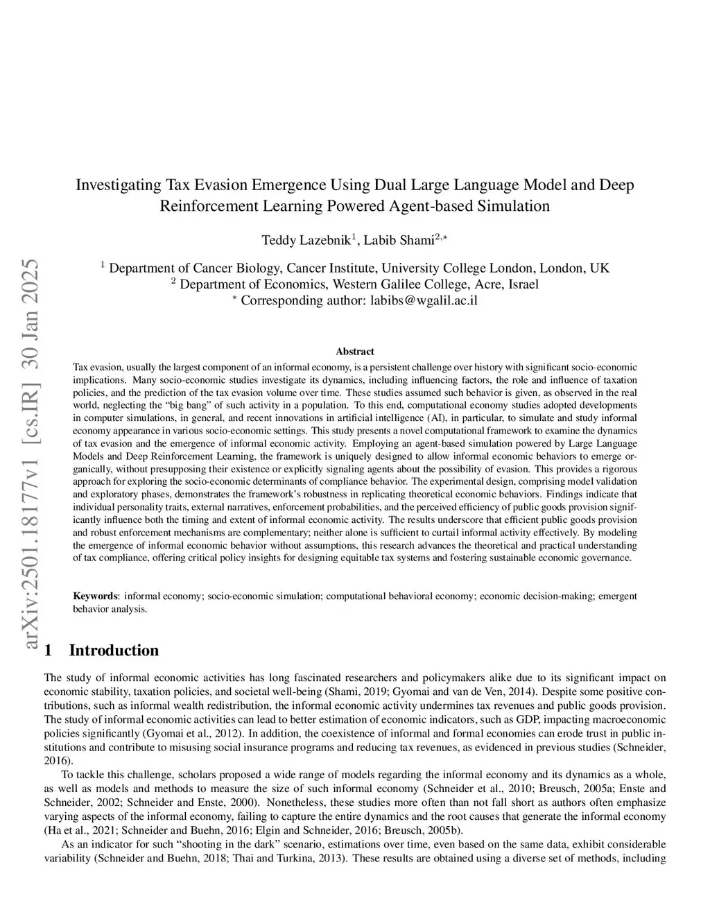 Tax evasion, usually the largest component of an informal economy, is a persistent challenge over history with significant socio-economic implications. Many socio-economic studies investigate its dynamics, including influencing factors, the role and influence of taxation policies, and the prediction of the tax evasion volume over time. These studies assumed such behavior is given, as observed in the real world, neglecting the "big bang" of such activity in a population. To this end, computational economy studies adopted developments in computer simulations, in general, and recent innovations in artificial intelligence (AI), in particular, to simulate and study informal economy appearance in various socio-economic settings. This study presents a novel computational framework to examine the dynamics of tax evasion and the emergence of informal economic activity. Employing an agent-based simulation powered by Large Language Models and Deep Reinforcement Learning, the framework is uniquely designed to allow informal economic behaviors to emerge organically, without presupposing their existence or explicitly signaling agents about the possibility of evasion. This provides a rigorous approach for exploring the socio-economic determinants of compliance behavior. The experimental design, comprising model validation and exploratory phases, demonstrates the framework's robustness in replicating theoretical economic behaviors. Findings indicate that individual personality traits, external narratives, enforcement probabilities, and the perceived efficiency of public goods provision significantly influence both the timing and extent of informal economic activity. The results underscore that efficient public goods provision and robust enforcement mechanisms are complementary; neither alone is sufficient to curtail informal activity effectively.