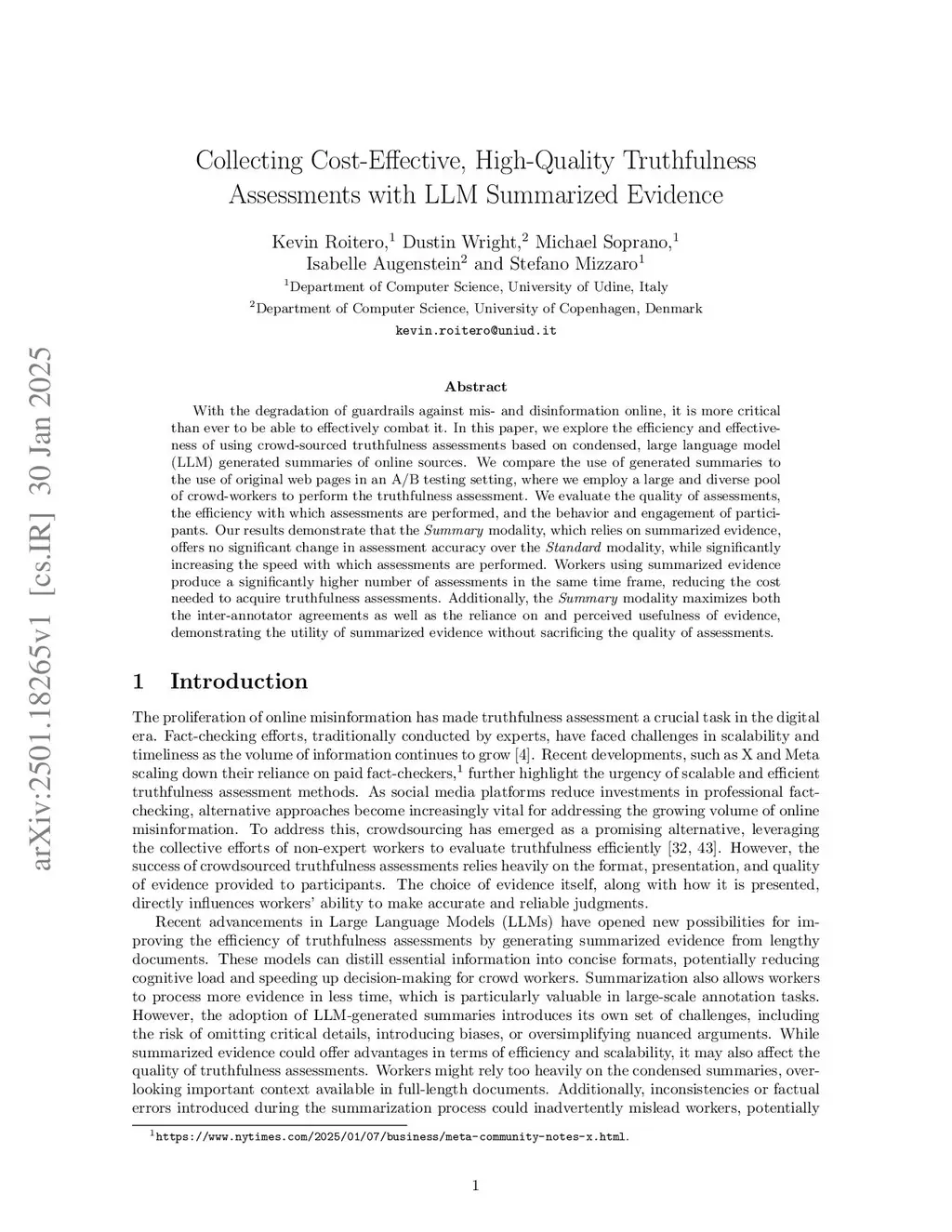 Evaluating the truthfulness of online content is critical for combating misinformation. This study examines the efficiency and effectiveness of crowdsourced truthfulness assessments through a comparative analysis of two approaches: one involving full-length webpages as evidence for each claim, and another using summaries for each evidence document generated with a large language model. Using an A/B testing setting, we engage a diverse pool of participants tasked with evaluating the truthfulness of statements under these conditions. Our analysis explores both the quality of assessments and the behavioral patterns of participants. The results reveal that relying on summarized evidence offers comparable accuracy and error metrics to the Standard modality while significantly improving efficiency. Workers in the Summary setting complete a significantly higher number of assessments, reducing task duration and costs. Additionally, the Summary modality maximizes internal agreement and maintains consistent reliance on and perceived usefulness of evidence, demonstrating its potential to streamline large-scale truthfulness evaluations.