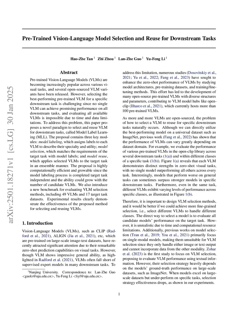 Pre-trained Vision-Language Models (VLMs) are becoming increasingly popular across various visual tasks, and several open-sourced VLM variants have been released. However, selecting the best-performing pre-trained VLM for a specific downstream task is challenging since no single VLM can achieve promising performance on all downstream tasks, and evaluating all available VLMs is impossible due to time and data limitations. To address this problem, this paper proposes a novel paradigm to select and reuse VLM for downstream tasks, called Model Label Learning (MLL). The proposal contains three key modules: \emph{model labeling}, which assigns labels to each VLM to describe their specialty and utility; \emph{model selection}, which matches the requirements of the target task with model labels; and \emph{model reuse}, which applies selected VLMs to the target task in an ensemble manner. The proposal is highly computationally efficient and growable since the model labeling process is completed target task independent and the ability could grow with the number of candidate VLMs. We also introduce a new benchmark for evaluating VLM selection methods, including 49 VLMs and 17 target task datasets. Experimental results clearly demonstrate the effectiveness of the proposed method for selecting and reusing VLMs.