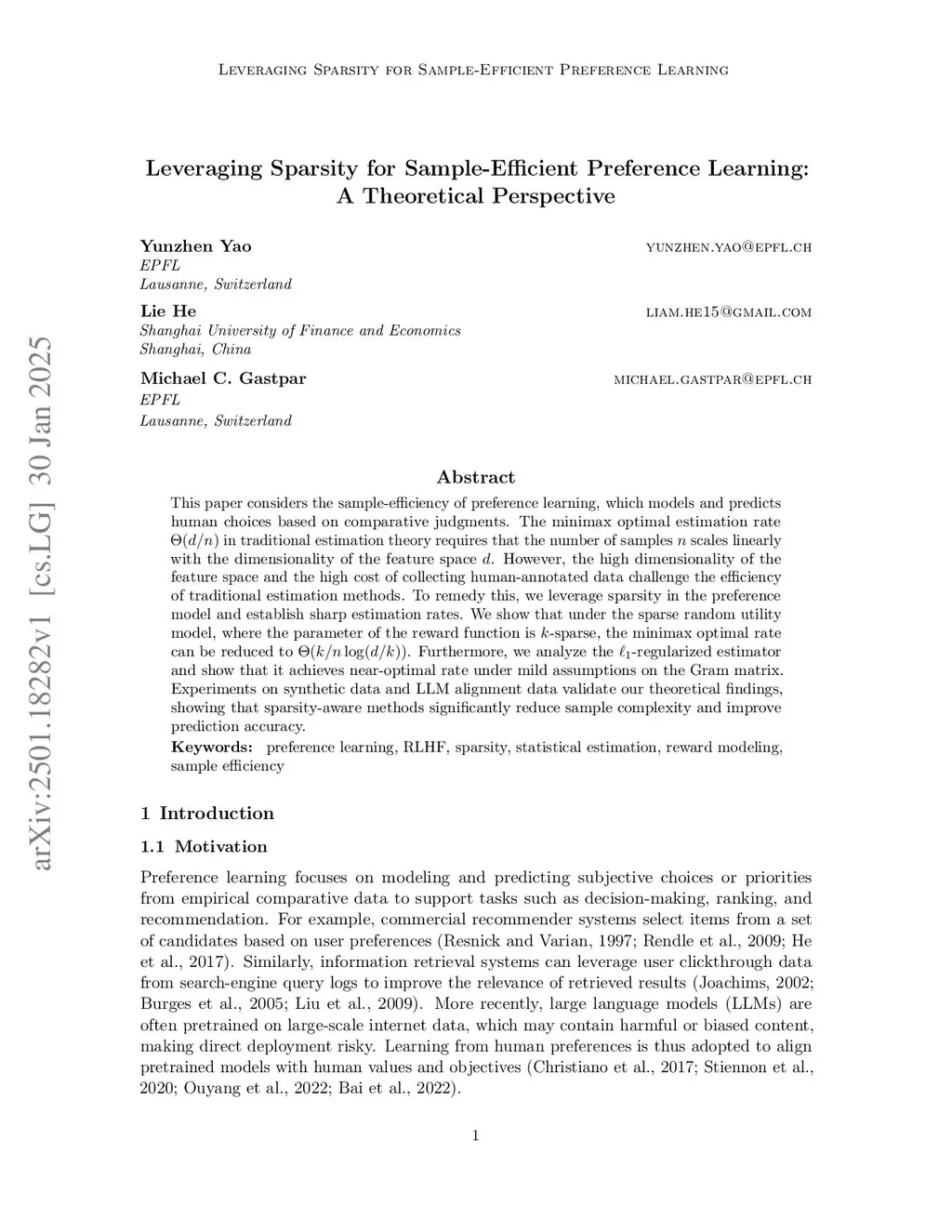This paper considers the sample-efficiency of preference learning, which models and predicts human choices based on comparative judgments. The minimax optimal estimation error rate in classical estimation theory requires that the number of samples scales linearly with the dimensionality of the feature space . However, the high dimensionality of the feature space and the high cost of collecting human-annotated data challenge the efficiency of traditional estimation methods. To remedy this, we leverage sparsity in the preference model and establish sharp error rates. We show that under the sparse random utility model, where the parameter of the reward function is -sparse, the minimax optimal rate can be reduced to . Furthermore, we analyze the -regularized estimator and show that it achieves near-optimal rate under mild assumptions on the Gram matrix. Experiments on synthetic data and LLM alignment data validate our theoretical findings, showing that sparsity-aware methods significantly reduce sample complexity and improve prediction accuracy.
