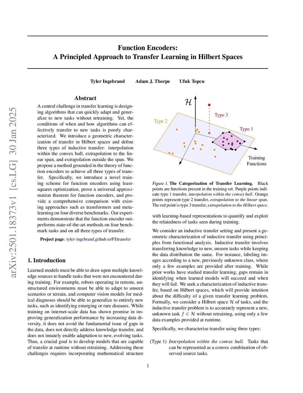 A central challenge in transfer learning is designing algorithms that can quickly adapt and generalize to new tasks without retraining. Yet, the conditions of when and how algorithms can effectively transfer to new tasks is poorly characterized. We introduce a geometric characterization of transfer in Hilbert spaces and define three types of inductive transfer: interpolation within the convex hull, extrapolation to the linear span, and extrapolation outside the span. We propose a method grounded in the theory of function encoders to achieve all three types of transfer. Specifically, we introduce a novel training scheme for function encoders using least-squares optimization, prove a universal approximation theorem for function encoders, and provide a comprehensive comparison with existing approaches such as transformers and meta-learning on four diverse benchmarks. Our experiments demonstrate that the function encoder outperforms state-of-the-art methods on four benchmark tasks and on all three types of transfer.