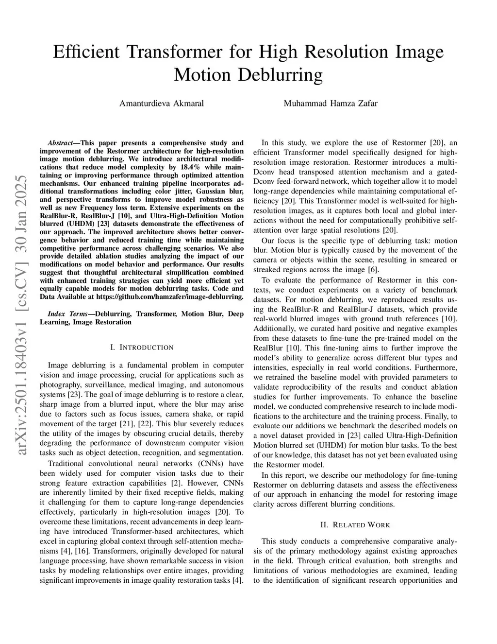 This paper presents a comprehensive study and improvement of the Restormer architecture for high-resolution image motion deblurring. We introduce architectural modifications that reduce model complexity by 18.4% while maintaining or improving performance through optimized attention mechanisms. Our enhanced training pipeline incorporates additional transformations including color jitter, Gaussian blur, and perspective transforms to improve model robustness as well as a new frequency loss term. Extensive experiments on the RealBlur-R, RealBlur-J, and Ultra-High-Definition Motion blurred (UHDM) datasets demonstrate the effectiveness of our approach. The improved architecture shows better convergence behavior and reduced training time while maintaining competitive performance across challenging scenarios. We also provide detailed ablation studies analyzing the impact of our modifications on model behavior and performance. Our results suggest that thoughtful architectural simplification combined with enhanced training strategies can yield more efficient yet equally capable models for motion deblurring tasks. Code and Data Available at:this https URL