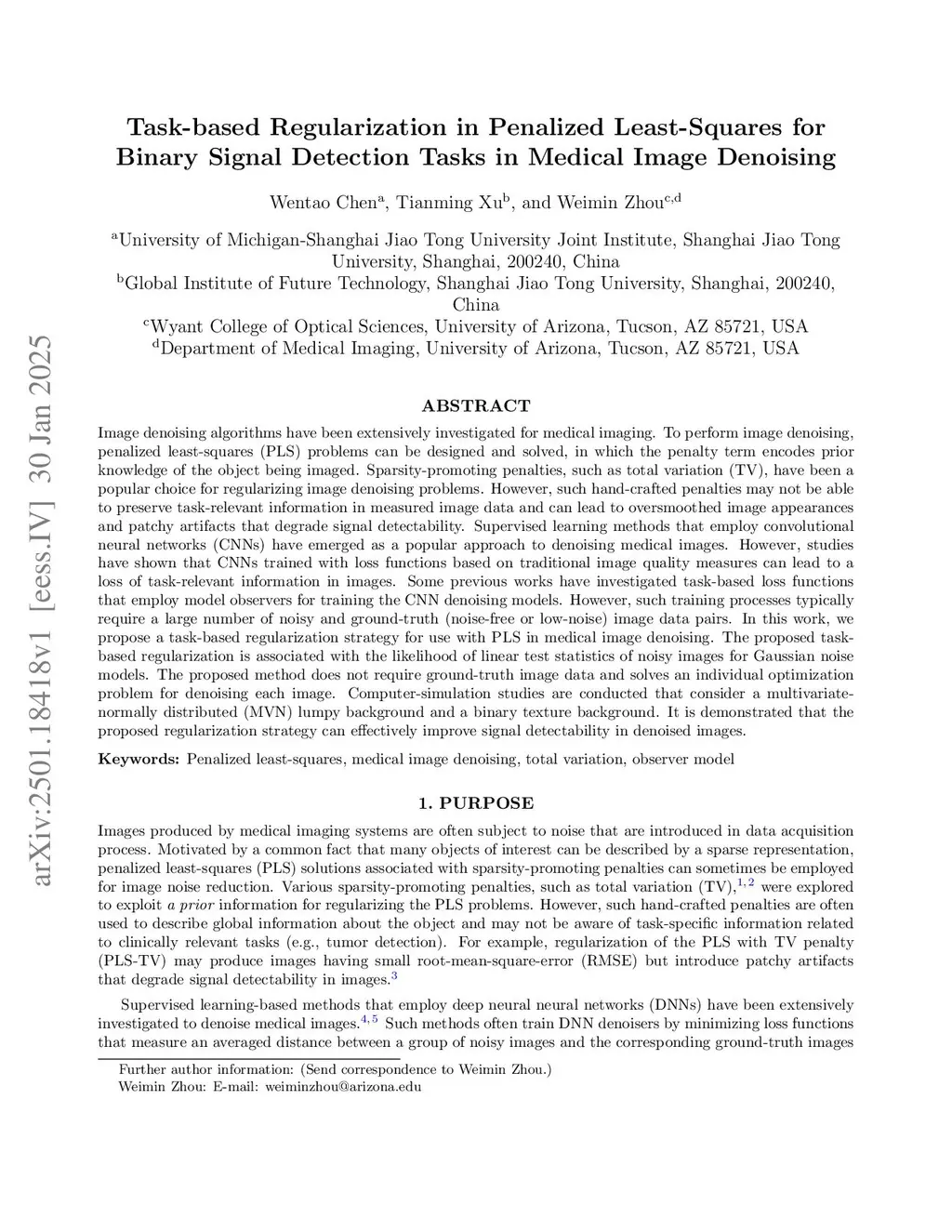 Image denoising algorithms have been extensively investigated for medical imaging. To perform image denoising, penalized least-squares (PLS) problems can be designed and solved, in which the penalty term encodes prior knowledge of the object being imaged. Sparsity-promoting penalties, such as total variation (TV), have been a popular choice for regularizing image denoising problems. However, such hand-crafted penalties may not be able to preserve task-relevant information in measured image data and can lead to oversmoothed image appearances and patchy artifacts that degrade signal detectability. Supervised learning methods that employ convolutional neural networks (CNNs) have emerged as a popular approach to denoising medical images. However, studies have shown that CNNs trained with loss functions based on traditional image quality measures can lead to a loss of task-relevant information in images. Some previous works have investigated task-based loss functions that employ model observers for training the CNN denoising models. However, such training processes typically require a large number of noisy and ground-truth (noise-free or low-noise) image data pairs. In this work, we propose a task-based regularization strategy for use with PLS in medical image denoising. The proposed task-based regularization is associated with the likelihood of linear test statistics of noisy images for Gaussian noise models. The proposed method does not require ground-truth image data and solves an individual optimization problem for denoising each image. Computer-simulation studies are conducted that consider a multivariate-normally distributed (MVN) lumpy background and a binary texture background. It is demonstrated that the proposed regularization strategy can effectively improve signal detectability in denoised images.
