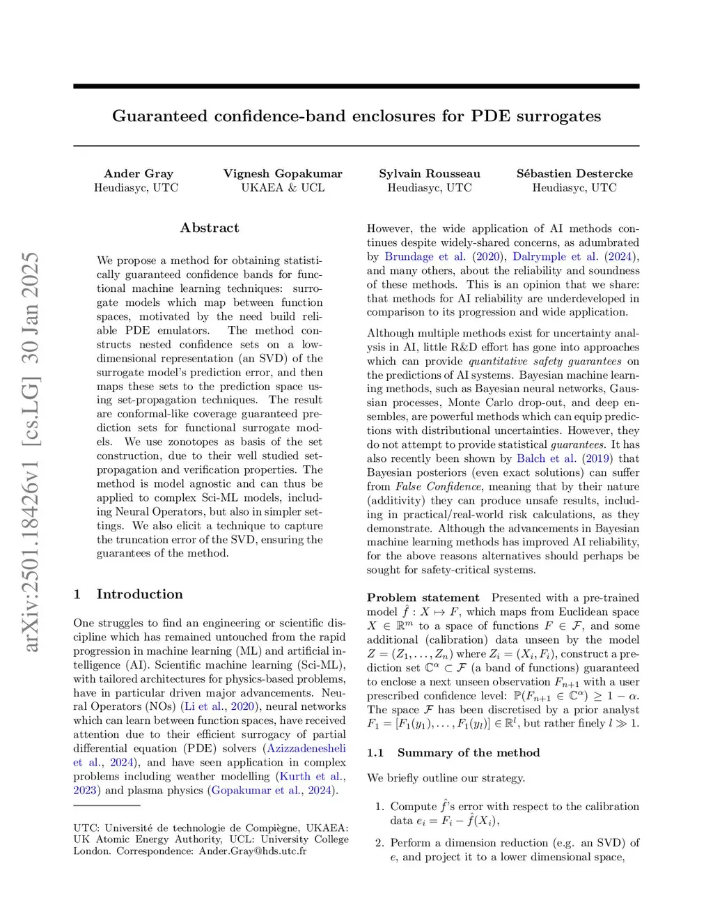 We propose a method for obtaining statistically guaranteed prediction sets for functional machine learning methods: surrogate models which map between function spaces, motivated by the need to build reliable PDE emulators. The method constructs nested prediction sets on a low-dimensional representation (an SVD) of the surrogate model's error, and then maps these sets to the prediction space using set-propagation techniques. This results in prediction sets for functional surrogate models with conformal prediction coverage guarantees. We use zonotopes as basis of the set construction, which allow an exact linear propagation and are closed under Cartesian products, making them well-suited to this high-dimensional problem. The method is model agnostic and can thus be applied to complex Sci-ML models, including Neural Operators, but also in simpler settings. We also introduce a technique to capture the truncation error of the SVD, preserving the guarantees of the method.