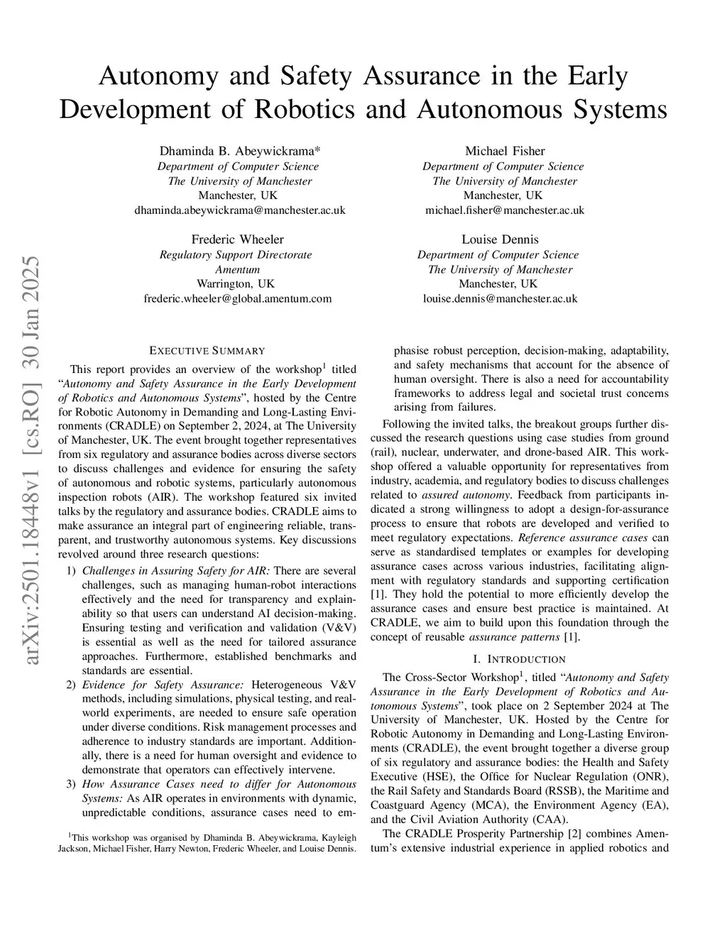 This report provides an overview of the workshop titled Autonomy and Safety Assurance in the Early Development of Robotics and Autonomous Systems, hosted by the Centre for Robotic Autonomy in Demanding and Long-Lasting Environments (CRADLE) on September 2, 2024, at The University of Manchester, UK. The event brought together representatives from six regulatory and assurance bodies across diverse sectors to discuss challenges and evidence for ensuring the safety of autonomous and robotic systems, particularly autonomous inspection robots (AIR). The workshop featured six invited talks by the regulatory and assurance bodies. CRADLE aims to make assurance an integral part of engineering reliable, transparent, and trustworthy autonomous systems. Key discussions revolved around three research questions: (i) challenges in assuring safety for AIR; (ii) evidence for safety assurance; and (iii) how assurance cases need to differ for autonomous systems. Following the invited talks, the breakout groups further discussed the research questions using case studies from ground (rail), nuclear, underwater, and drone-based AIR. This workshop offered a valuable opportunity for representatives from industry, academia, and regulatory bodies to discuss challenges related to assured autonomy. Feedback from participants indicated a strong willingness to adopt a design-for-assurance process to ensure that robots are developed and verified to meet regulatory expectations.