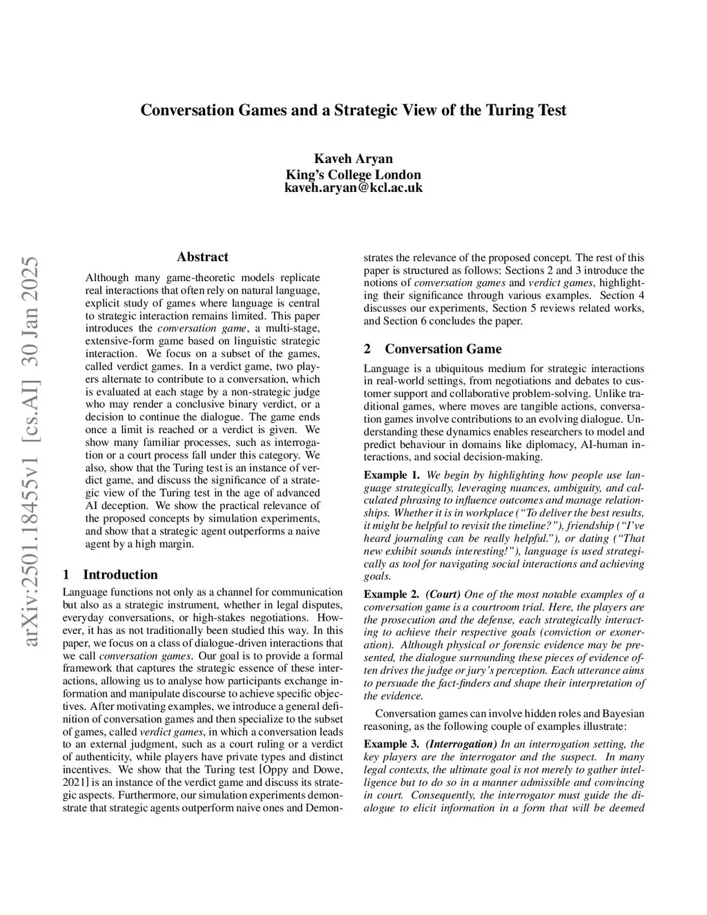 Although many game-theoretic models replicate real interactions that often rely on natural language, explicit study of games where language is central to strategic interaction remains limited. This paper introduces the \emph{conversation game}, a multi-stage, extensive-form game based on linguistic strategic interaction. We focus on a subset of the games, called verdict games. In a verdict game, two players alternate to contribute to a conversation, which is evaluated at each stage by a non-strategic judge who may render a conclusive binary verdict, or a decision to continue the dialogue. The game ends once a limit is reached or a verdict is given. We show many familiar processes, such as interrogation or a court process fall under this category. We also, show that the Turing test is an instance of verdict game, and discuss the significance of a strategic view of the Turing test in the age of advanced AI deception. We show the practical relevance of the proposed concepts by simulation experiments, and show that a strategic agent outperforms a naive agent by a high margin.