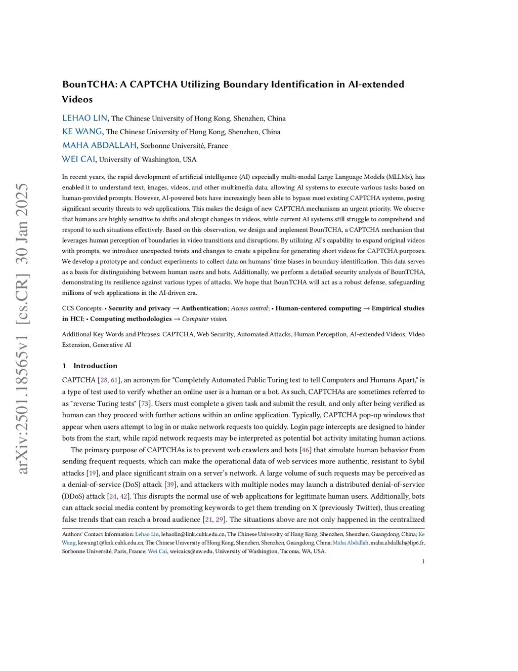 In recent years, the rapid development of artificial intelligence (AI) especially multi-modal Large Language Models (MLLMs), has enabled it to understand text, images, videos, and other multimedia data, allowing AI systems to execute various tasks based on human-provided prompts. However, AI-powered bots have increasingly been able to bypass most existing CAPTCHA systems, posing significant security threats to web applications. This makes the design of new CAPTCHA mechanisms an urgent priority. We observe that humans are highly sensitive to shifts and abrupt changes in videos, while current AI systems still struggle to comprehend and respond to such situations effectively. Based on this observation, we design and implement BounTCHA, a CAPTCHA mechanism that leverages human perception of boundaries in video transitions and disruptions. By utilizing generative AI's capability to extend original videos with prompts, we introduce unexpected twists and changes to create a pipeline for generating guided short videos for CAPTCHA purposes. We develop a prototype and conduct experiments to collect data on humans' time biases in boundary identification. This data serves as a basis for distinguishing between human users and bots. Additionally, we perform a detailed security analysis of BounTCHA, demonstrating its resilience against various types of attacks. We hope that BounTCHA will act as a robust defense, safeguarding millions of web applications in the AI-driven era.